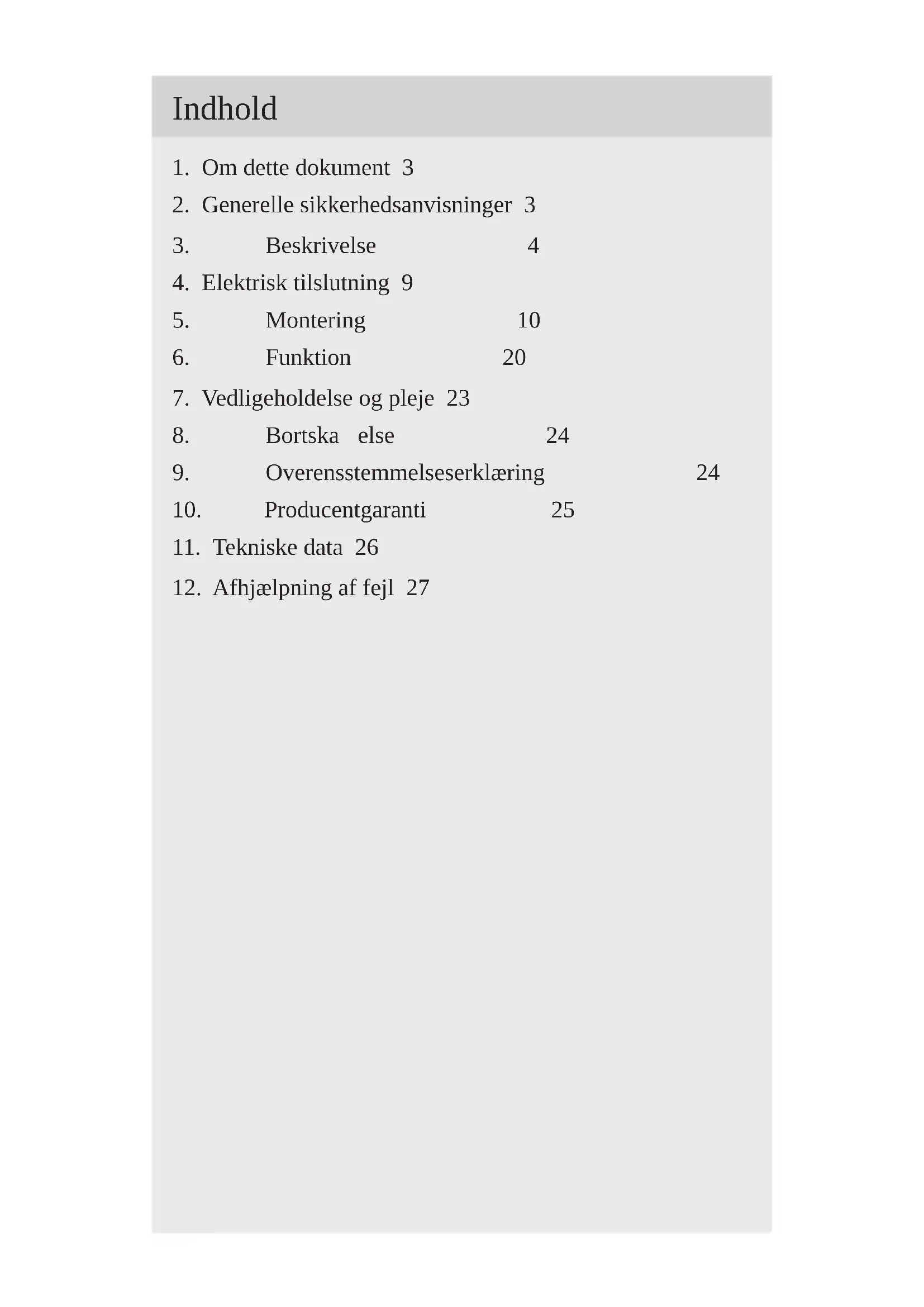 - Rengør produktet med en let fugtig klud uden rengø- ringsmiddel. Vigtigt: Transformeren kan ikke udskiftes.– 24 – Indhold