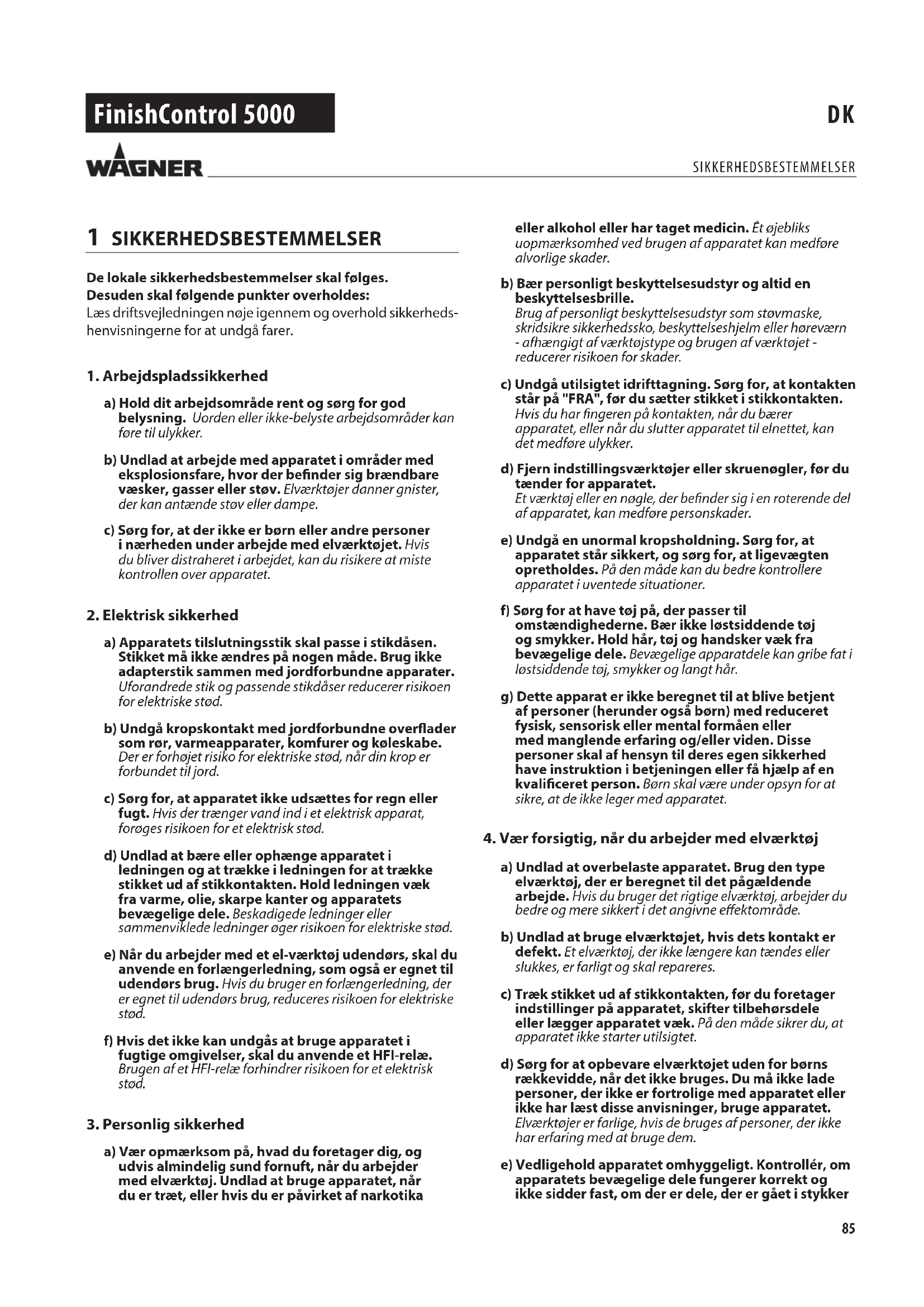 3. ProcedureViser der sig inden for garantiperioden fejl i enhedens mate-riale, forarbejdning eller ydelse, skal garantikravet gøres gæl-dende straks, senest dog inden for en frist på 2 uger. Den autoriserede specialforretning, der har udleveret enhe-den, er bemyndiget til at modtage garantikrav. Krav i henhold til garantien kan imidlertid også gøres gældende over for de serviceværksteder, der er nævnt i betjeningsvejledningen. Produktet skal indsendes med betalt porto eller aeveres sammen med den originale faktura eller kvittering, der skal indeholde angivelse af købsdatoen og produktbetegnelsen. Hvis der gøres krav gældende i henhold til forlængelsen af ga-rantien, skal garantibeviset også vedlægges. Forsendelsesomkostningerne og risikoen for tab eller beska-digelse af produktet på vej til eller fra det værksted eller den forretning, der modtager garantikravet, eller som igen udleve-rer det reparerede produkt, bæres af kunden.4. Bortfald af garantienGarantikrav kan ikke tages i betragtning på dele, der er udsat for et brugsbetinget eller andet naturligt slid, samt mangler ved produktet, som kan føres tilbage til et brugsbetinget eller andet naturligt slid. Herunder hører især kabler, pakninger, dyser, cylindre, stempler, dele af huset, gennem hvilke mediet føres, ltre, slanger, tætninger, rotorer, statorer etc. Skader som følge af slid forårsages især af slibende påføringsmaterialer som f.eks. dispersioner, puds, spartelmasse, klæbestoer, glasurer og kvartsgrunder. Ved fejl på enheder, der skyldes køberens eller tredjemands manglende overholdelse af anvisninger om betjeningen, uegnet eller ukyndig anvendelse, forkert montering eller idriftsættelse, ikke-bestemmelsesmæssig brug, unormale miljøbetingelser, uegnet påføringsmateriale, kemisk, elektrokemisk eller elektrisk indydelse, unormale driftsbetingelser, drift med forkert netspænding eller netfrekvens, overbelastning eller manglende vedligeholdelse, pleje eller rengøring Ved fejl på enheden, som skyldes anvendelsen af tilbehør, ekstraudstyr eller reservedele, som ikke er originaldele fra Wagner For produkter, på hvilke der er foretaget ændringer eller påmonteret udvidelser. For produkter, hvis serienummer er fjernet eller gjort ulæseligt For produkter, som er forsøgt repareret af uautoriserede personer. For produkter med ubetydelige afvigelser fra de nominelle tilstand, som er uvæsentlige for enhedens værdi og anvendelighed. For produkter, der er blevet helt eller delvis adskilt5. Supplerende bestemmelserOvenstående garantier gælder udelukkende for produkter, som købes i autoriserede specialforretninger i EU, SNG og Australien, og som anvendes i købslandet.Hvis det ved nærmere undersøgelse viser sig, at garantien ikke dækker den foreliggende fejl, foretages reparation på købers regning.Ovenstående bestemmelser udgør en denitiv fastlæggelse af retsforholdet til os. Videregående krav, specielt på grundlag af skader og tab ligegyldigt af hvilken art, der forårsages af produktet eller som følge af brugen af dette, er udelukkede, undtagen for så vidt de er omfattet af produktansvarslovens gyldighedsområde. Krav imod specialforretningen som følge af dennes ansvar for mangler berøres ikke af denne garanti.For denne garanti gælder tysk ret. Aftalesproget er tysk. I til-fælde af, at betydningen af den tyske og en udenlandsk tekst med disse garantibestemmelser afviger fra hinanden, gælder betydningen af den tyske tekst.J. Wagner GmbHDivision Professional FinishingOtto Lilienthal Strasse 18 88677 MarkdorfForbundsrepublikken TysklandRet til ændringer forbeholdes EU Overensstemmelseserklæring Vi erklærer under almindeligt ansvar, at dette produkt er i overensstemmelse med følgende bestemmelser: 2006/42/EF, 2014/30/EU, 2011/65/EU, 2012/19/EUAnvendte harmoniserede normer: EN 60745-1, EN 50580, EN 62233, EN 55014-1, EN 55014-2, EN 61000-3-2, EN 61000-3-3, EN 61000-4-2, EN 61000-4-4, EN 61000-4-5, EN 61000-4-6, EN 61000-4-11 EU Overensstemmelseserklæringen er vedlagt produktet. Om nødvendigt kan den efterbestilles med bestillingsnum-mer 2368397. GARANTIERKLÆRING97 FinishControl 5000