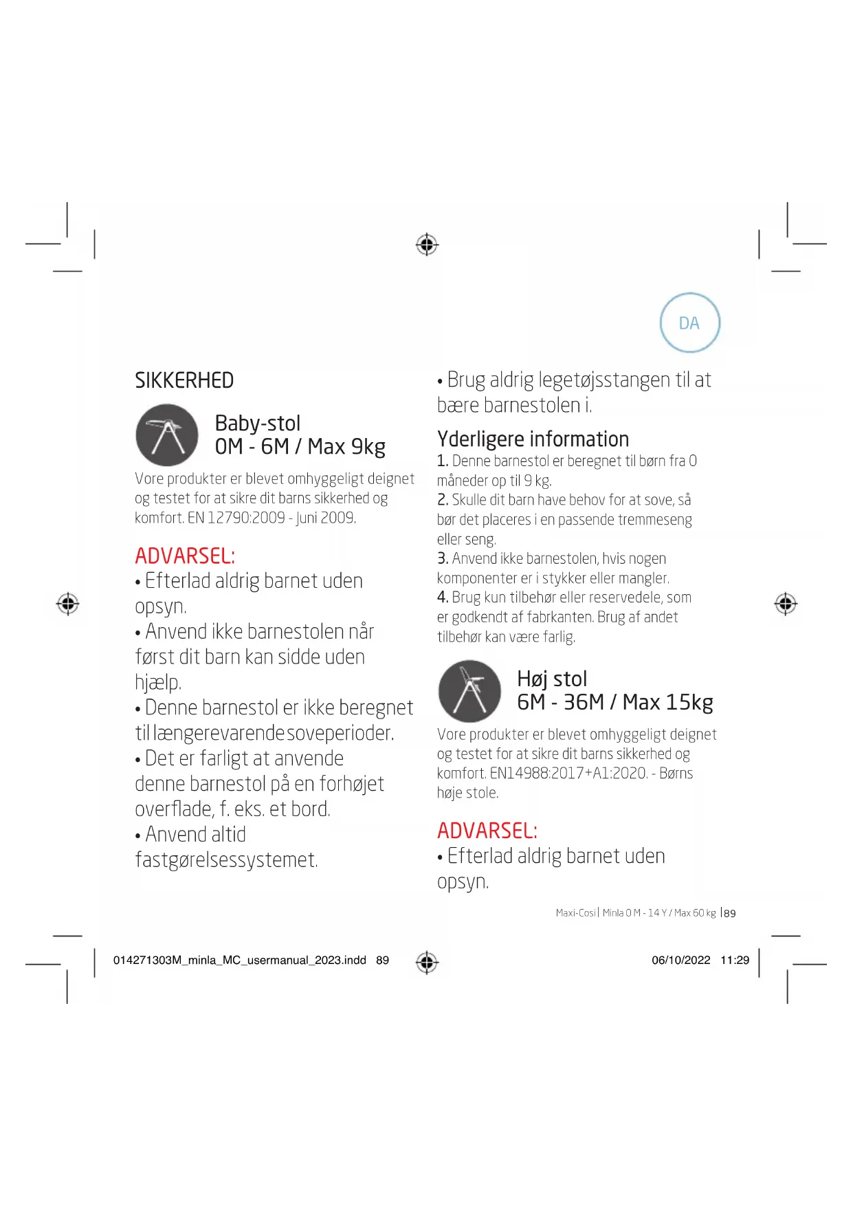 rettigheder og/eller skader og/eller defekter med hensyn til produkter, der ikke er omfattet af vores garanti, kan behandles for et rimeligt gebyr. Forbrugerens rettigheder: En forbruger har juridiske rettigheder ifølge gældende forbrugerlovgivning, hvilket kan variere fra land til land. Forbrugerens rettigheder under gældende national lovgivning påvirkes ikke af denne garanti. Denne garanti er udstedt af Dorel Netherlands. Vi er registreret i Holland under firmanummer 17060920. Vor handelsadresse er Korendijk 5, 5704 RD Helmond, Holland, og vor postadresse er P.O.Box 6071, 5700 ET Helmond, Holland. Navne og adresser på andre datterselskaber i Dorel-gruppen kan findes på den sidste side i denne vejledning og på vor hjemmeside for det pågældende produkt. (1) Produkter købt fra detailhandlere eller forhandlere, der erner eller ændrer etiketter eller identifikationsnumre, betragtes som uautoriserede. Der ydes ingen garanti for disse produkter, da ægtheden af disse produkter ikke kan fastslås. 014271303M_minla_MC_usermanual_2023.indd 94014271303M_minla_MC_usermanual_2023.indd 94 06/10/2022 11:2906/10/2022 11:29Maxi-Cosi