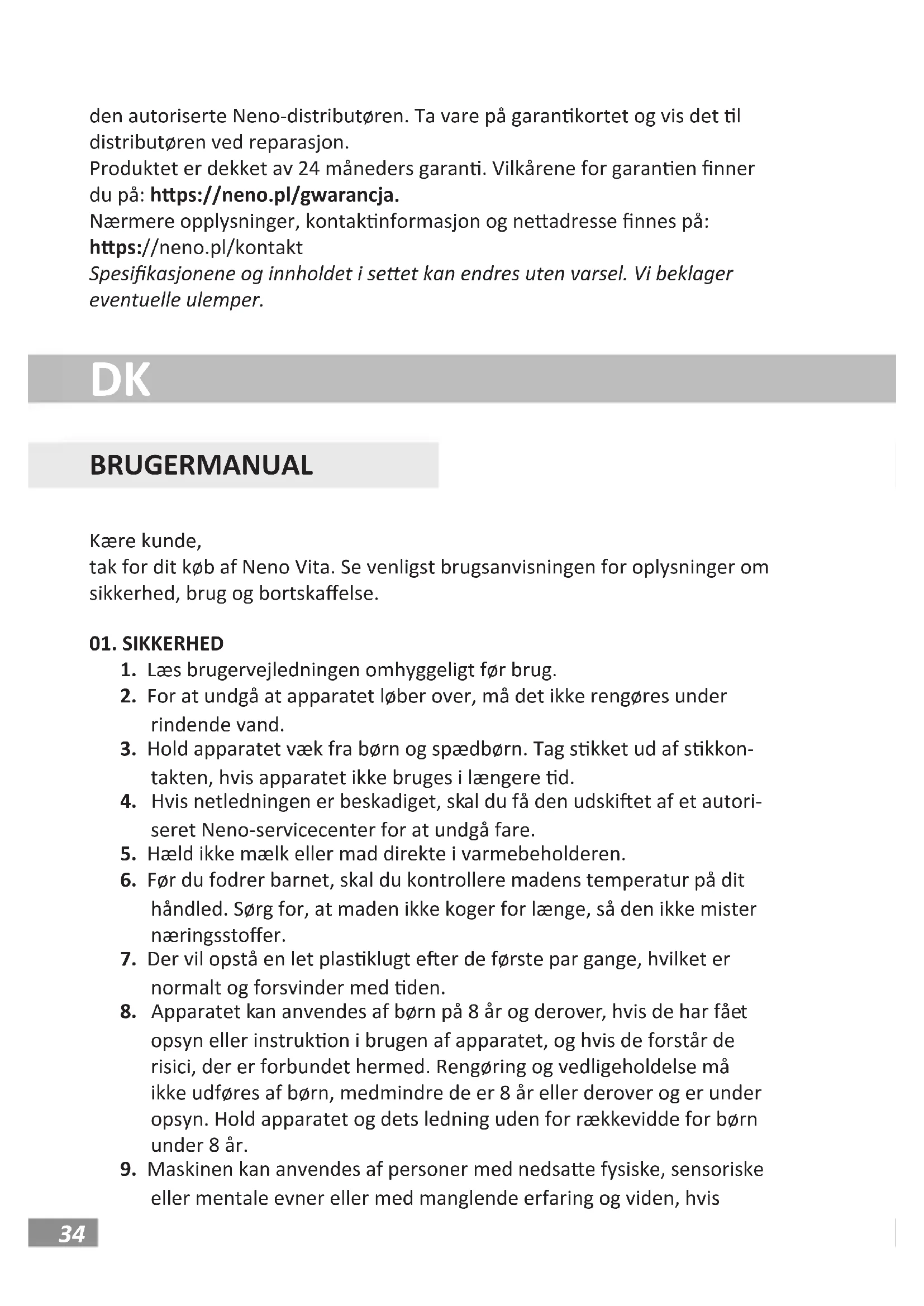 BRUGERMANUAL Kære kunde, tak for dit køb af Neno Vita. Se venligst brugsanvisningen for oplysninger om sikkerhed, brug og bortskaelse.