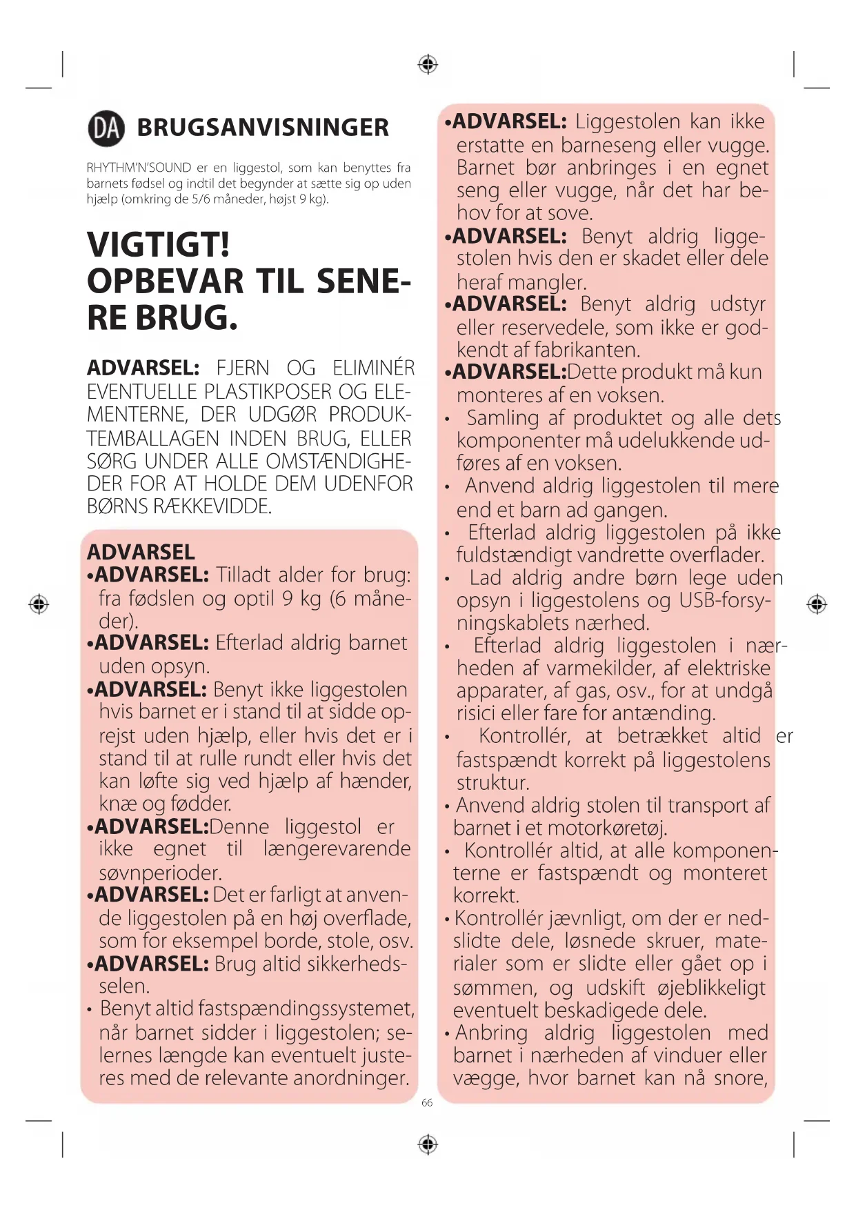 - ADVARSEL: Benyt ikke liggestolen hvis barnet er i stand til at sidde op- rejst uden hjælp, eller hvis det er i stand til at rulle rundt eller hvis det kan løfte sig ved hjælp af hænder, knæ og fødder.