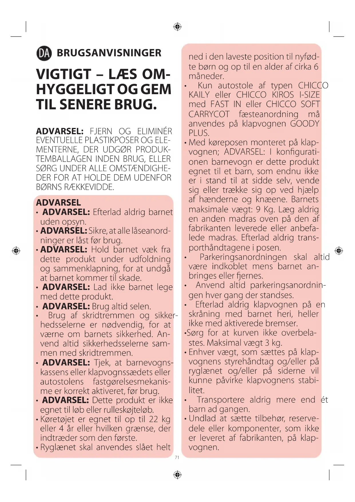 - Kun autostole af typen CHICCO KAILY eller CHICCO KIROS I-SIZE med FAST IN eller CHICCO SOFT CARRYCOT fæsteanordning må anvendes på klapvognen GOODY PLUS.