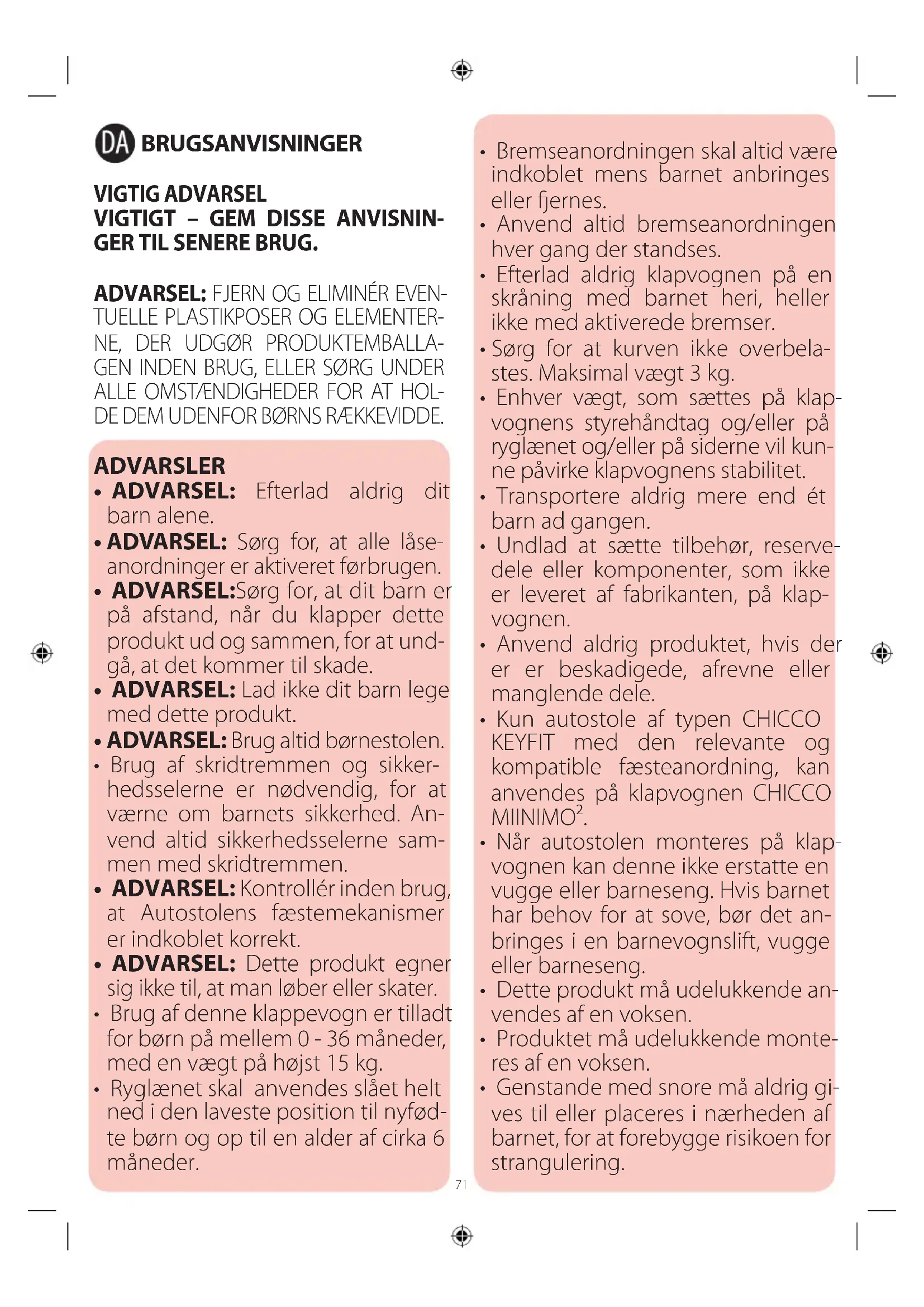 vist i (Fig. 22), for at sætte skinnen på strukturen igen. ADVARSEL: Spænd altid barnets sikkerhedsseler. Skinnen er IKKE en fastspændingsanordning for barnet ADVARSEL: Skinnen må aldrig anvendes til at løfte pro- duktet med barnet anbragt heri. Takket være den relevante adapter (som sælges separat) er det muligt at hægte autostolen Chicco KeyFit på klapvo- gnen Chicco Miinimo². Indhent oplysninger om monte- ring og brug af adapteren og autostolen i de relevante brugsvejledninger. GARANTI Produktet er garanteret mod enhver fejl i form af mang- lende overensstemmelse under normale brugsbetingelser, som beskrevet i brugsanvisningerne. Garantien bortfalder i tilfælde af fejl som følge af ukorrekt brug, slid eller hænde- lige uheld. Hvad angår garantiens varighed, med hensyn til fejl i form af manglende overensstemmelse, henvises der til de specikke forskrifter i den gældende lov i landet, hvor produktet er købt, hvis sådanne er forudset.75