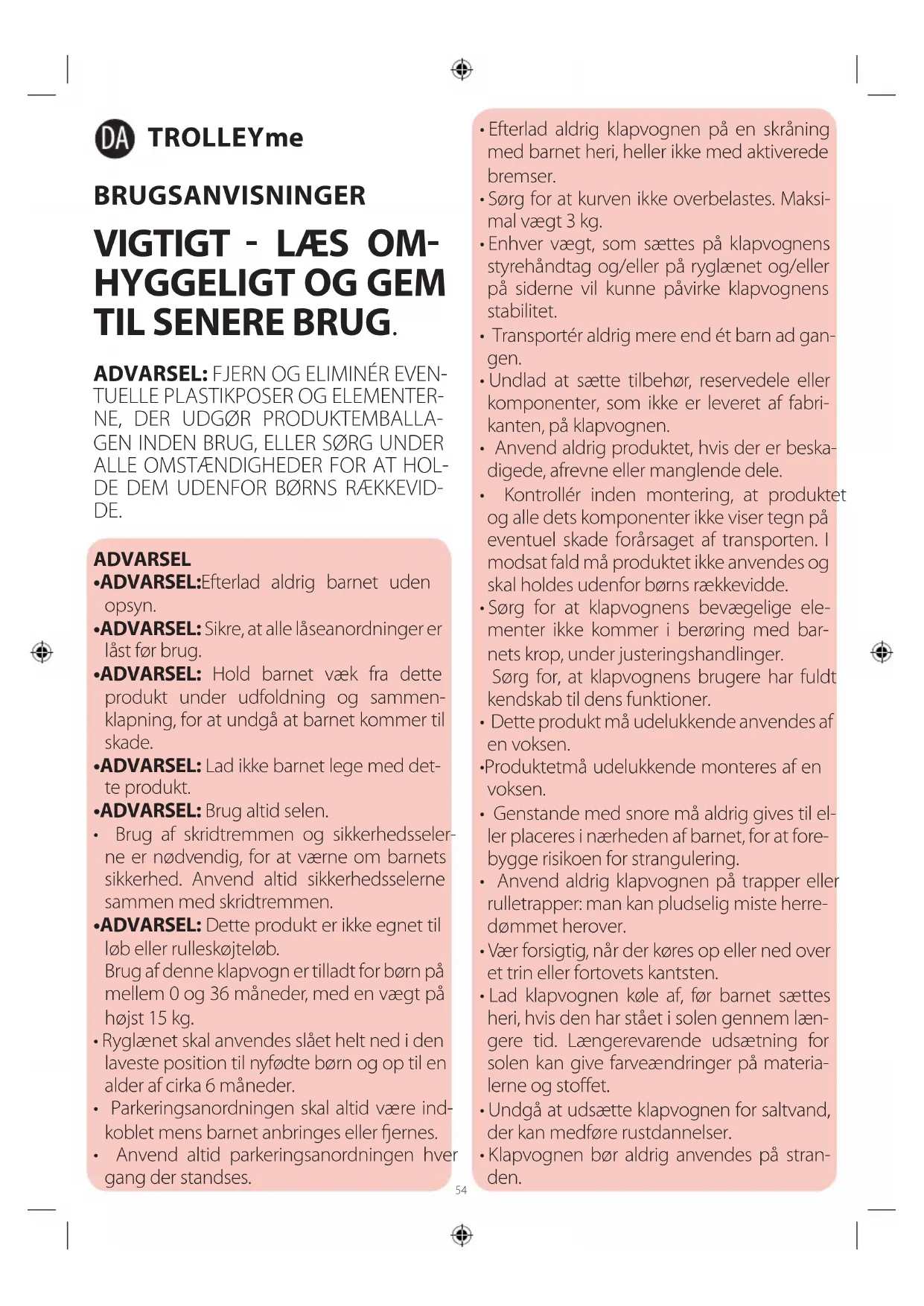 - ADVARSEL: Dette produkt er ikke egnet til løb eller rulleskøjteløb. Brug af denne klapvogn er tilladt for børn på mellem 0 og 36 måneder, med en vægt på højst 15 kg.
