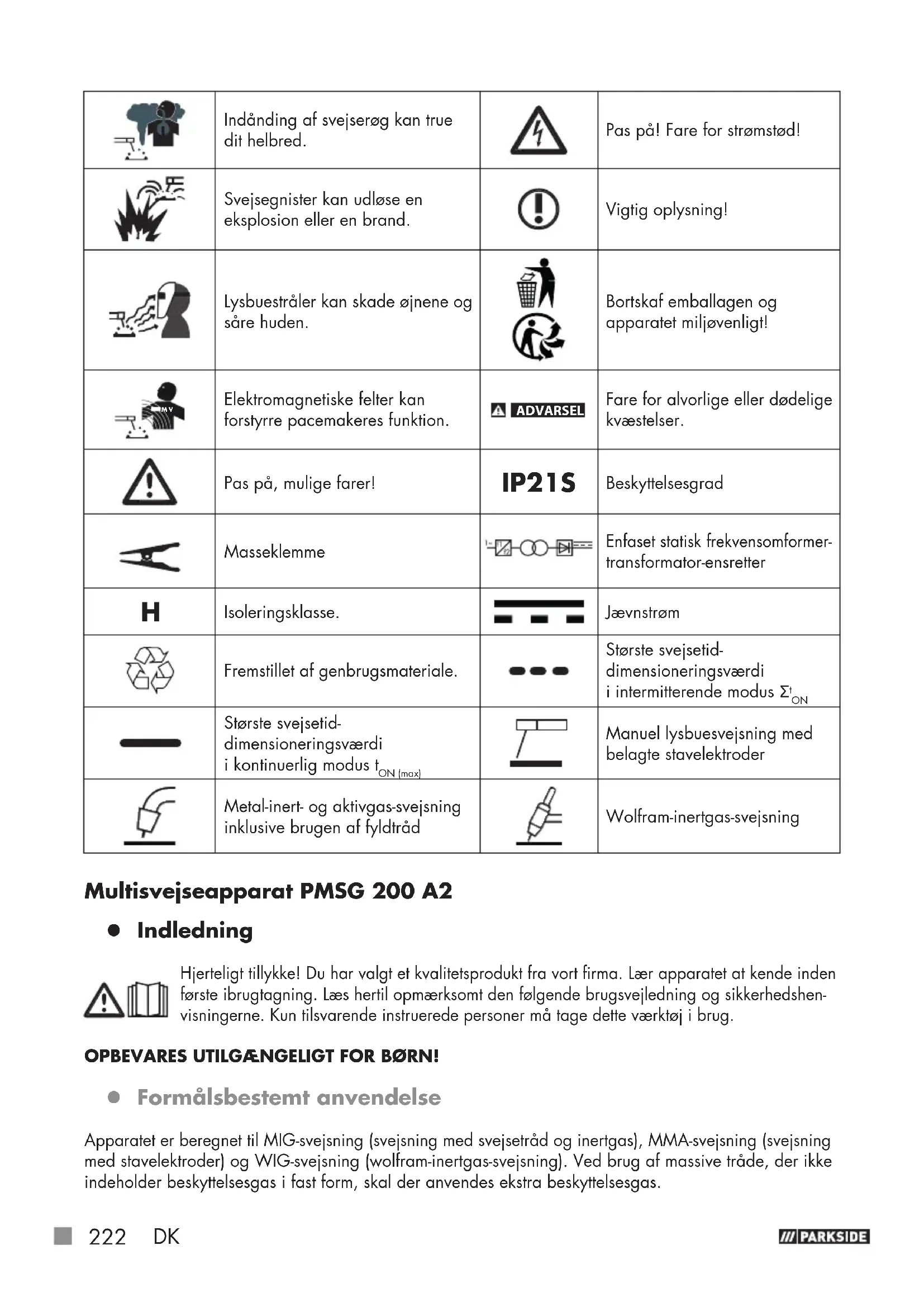 Største svejsetid- dimensioneringsværdi i kontinuerlig modus t ON (max) Manuel lysbuesvejsning med belagte stavelektroder Metal-inert- og aktivgas-svejsning inklusive brugen af fyldtråd Wolfram-inertgas-svejsning Multisvejseapparat PMSG 200 A2 z Indledning Hjerteligt tillykke! Du har valgt et kvalitetsprodukt fra vort firma. Lær apparatet at kende inden første ibrugtagning. Læs hertil opmærksomt den følgende brugsvejledning og sikkerhedshen- visningerne. Kun tilsvarende instruerede personer må tage dette værktøj i brug. OPBEVARES UTILGÆNGELIGT FOR BØRN! z Formålsbestemt anvendelse Apparatet er beregnet til MIG-svejsning (svejsning med svejsetråd og inertgas), MMA-svejsning (svejsning med stavelektroder) og WIG-svejsning (wolfram-inertgas-svejsning). Ved brug af massive tråde, der ikke indeholder beskyttelsesgas i fast form, skal der anvendes ekstra beskyttelsesgas.DK