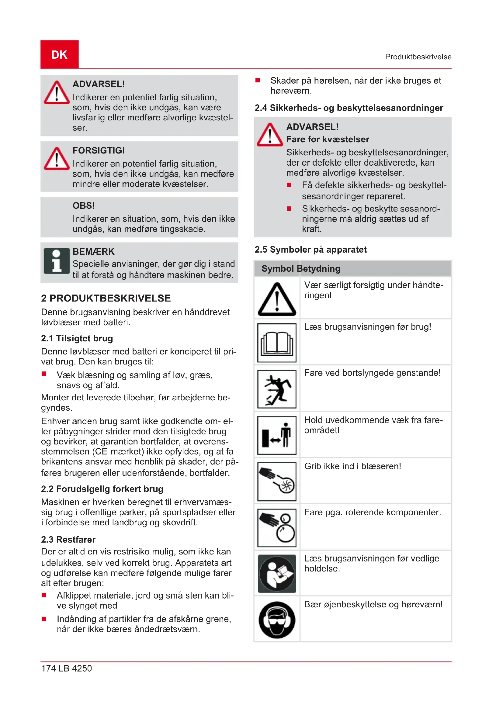 FARE! Indikerer en umiddelbar farlig situation, som, hvis den ikke undgås, er livsfarlig eller medfører alvorlige kvæstelser.DK 174 LB 4250 Produktbeskrivelse ADVARSEL! Indikerer en potentiel farlig situation, som, hvis den ikke undgås, kan være livsfarlig eller medføre alvorlige kvæstel- ser. FORSIGTIG! Indikerer en potentiel farlig situation, som, hvis den ikke undgås, kan medføre mindre eller moderate kvæstelser. OBS! Indikerer en situation, som, hvis den ikke undgås, kan medføre tingsskade. BEMÆRK Specielle anvisninger, der gør dig i stand til at forstå og håndtere maskinen bedre. 2 PRODUKTBESKRIVELSE Denne brugsanvisning beskriver en hånddrevet løvblæser med batteri.
