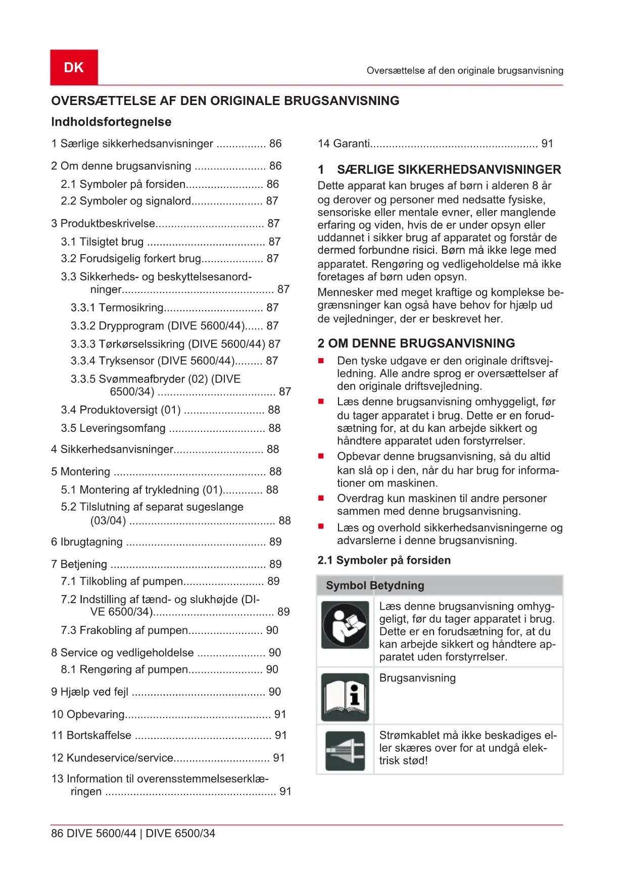 Pumperne slår automatisk til (02/a) via svømme- afbryderen, når en bestemt vandstand nås (til- koblingshøjde). Når vandstanden falder, slår den fra igen ved frakoblingshøjden (02/b). Svømme- afbryderen skal kunne bevæge sig frit på vandoverfladen.DK 88 DIVE 5600/44 | DIVE 6500/34 Sikkerhedsanvisninger