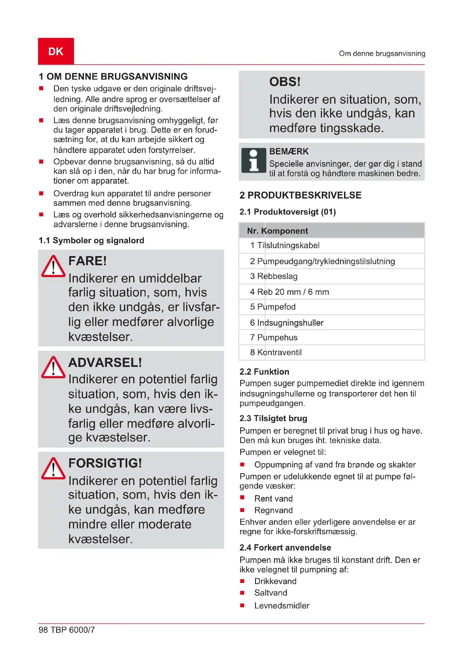 Pumpe og forlængerledning ma kun anvendes i tekisk fejlfri tilstand. Beskadigede pumper ma ikke betjenes.