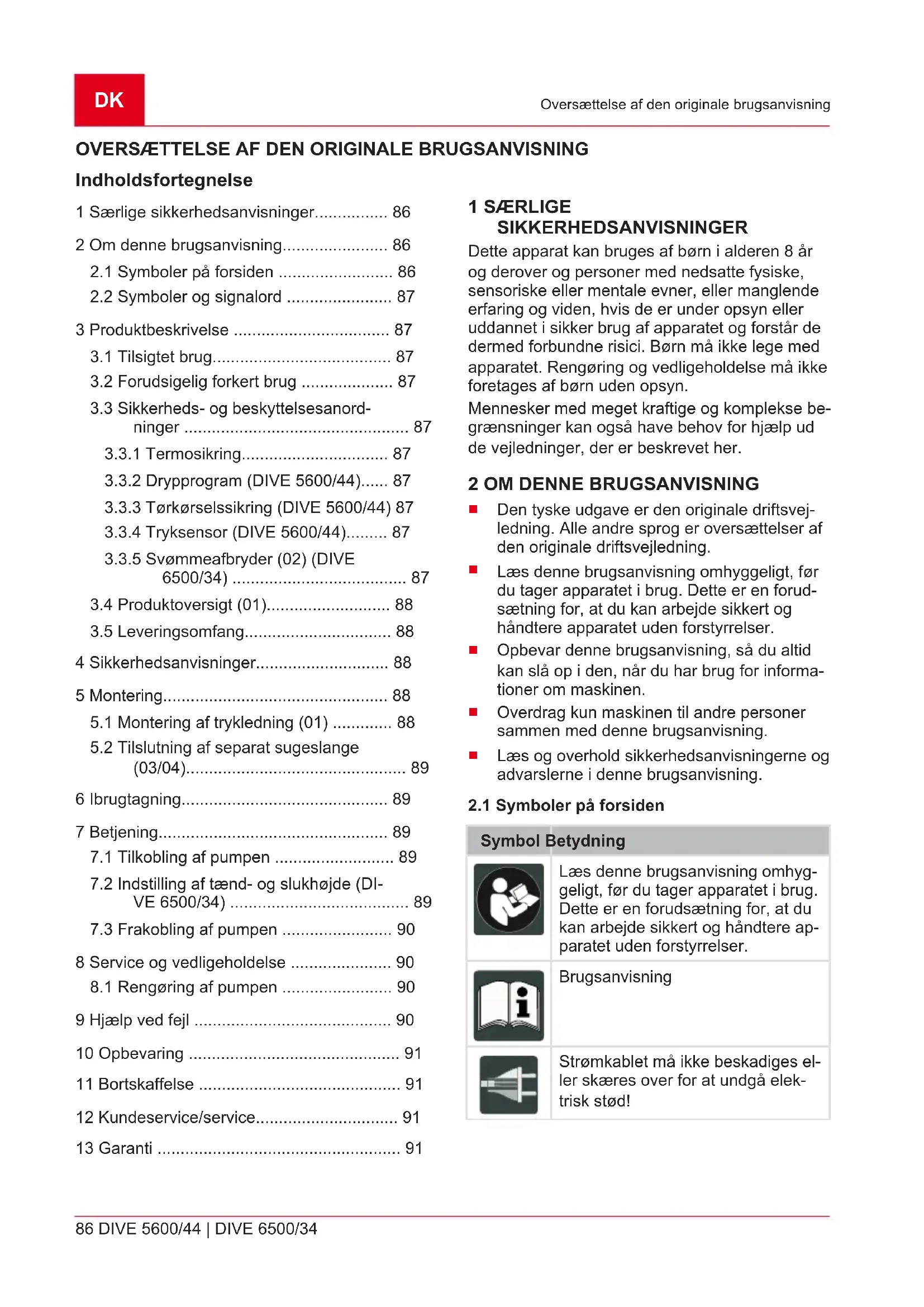 Sliddele, der er markeret med ramme xxxxxx (x) på reservedelslisten Garantiperioden begynder med købet foretaget af den første slutforbruger. Datoen på købskvitterin- gen er gældende. Kontakt forhandleren, hvor maskinen er købt, eller den nærmeste autoriserede kun- deservice. Medbring denne erklæring og den originale købskvittering. Denne erklæring berører ikke købers lovbestemte rettigheder over for sælger på grund af mangler.SE 92 DIVE 5600/44 | DIVE 6500/34 Översättning av originalbruksanvisning