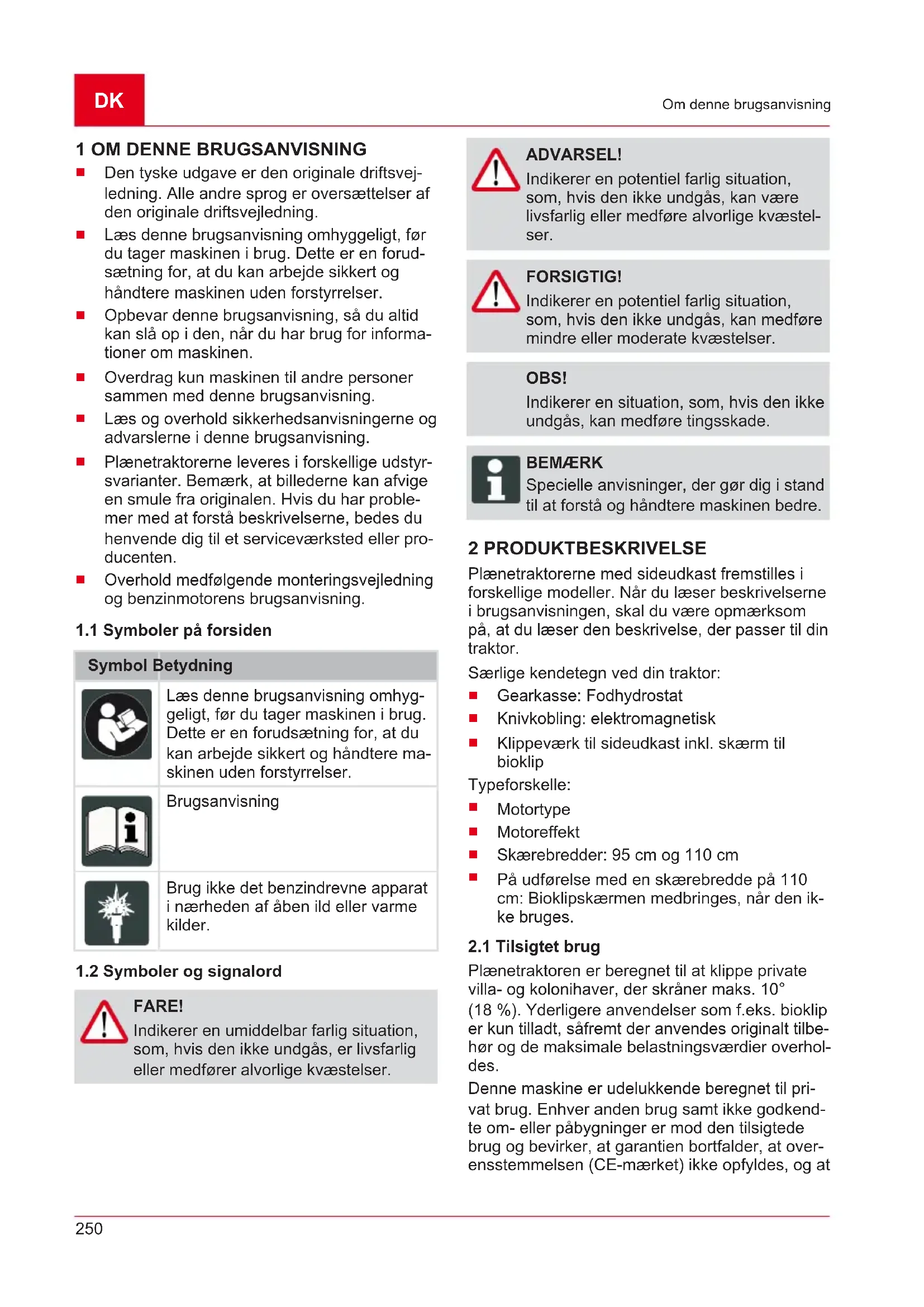FARE! Indikerer en umiddelbar farlig situation, som, hvis den ikke undgås, er livsfarlig eller medfører alvorlige kvæstelser. ADVARSEL! Indikerer en potentiel farlig situation, som, hvis den ikke undgås, kan være livsfarlig eller medføre alvorlige kvæstel- ser. FORSIGTIG! Indikerer en potentiel farlig situation, som, hvis den ikke undgås, kan medføre mindre eller moderate kvæstelser. OBS! Indikerer en situation, som, hvis den ikke undgås, kan medføre tingsskade. BEMÆRK Specielle anvisninger, der gør dig i stand til at forstå og håndtere maskinen bedre. 2 PRODUKTBESKRIVELSE Plænetraktorerne med sideudkast fremstilles i forskellige modeller. Når du læser beskrivelserne i brugsanvisningen, skal du være opmærksom på, at du læser den beskrivelse, der passer til din traktor. Særlige kendetegn ved din traktor: