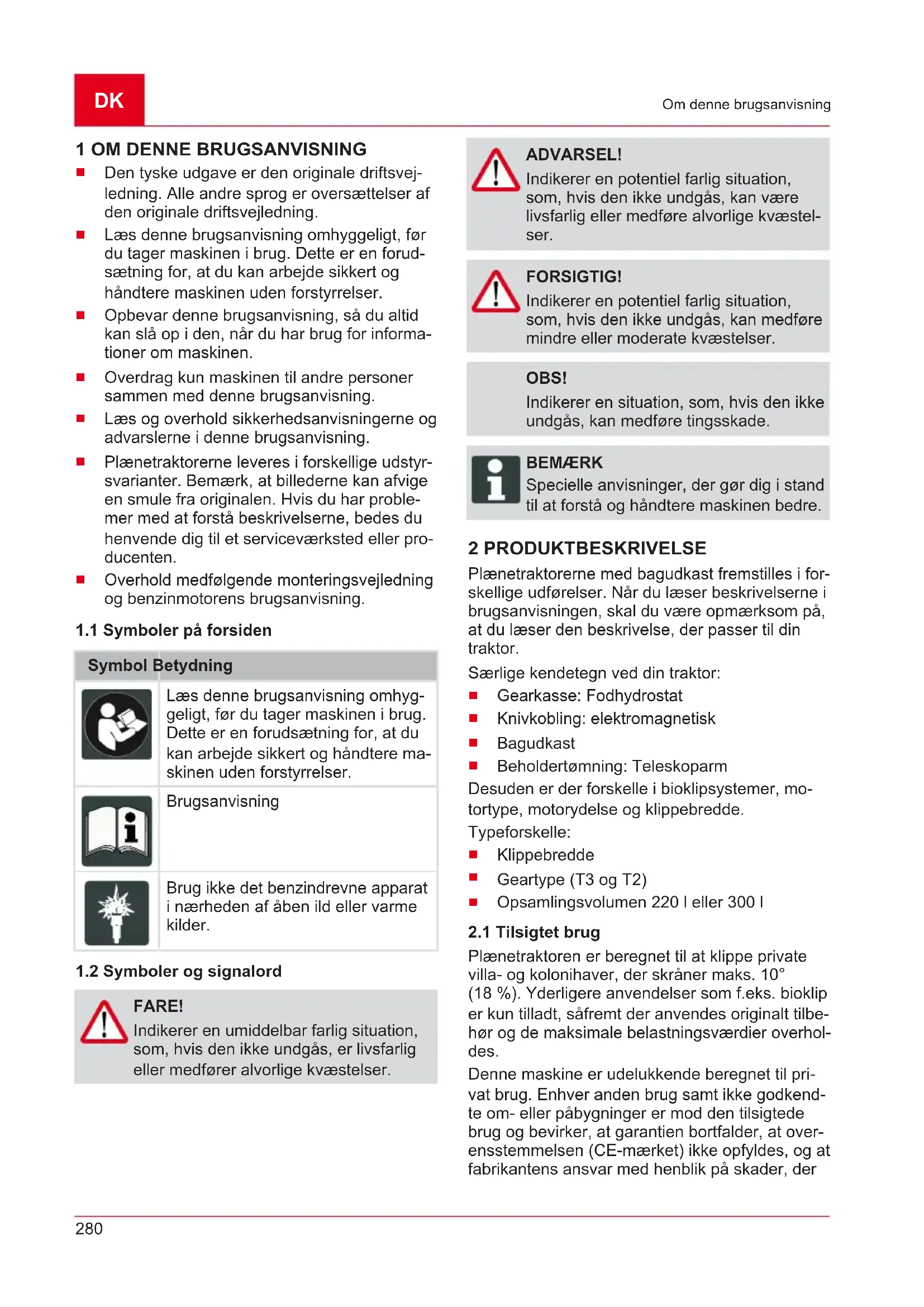 FARE! Indikerer en umiddelbar farlig situation, som, hvis den ikke undgås, er livsfarlig eller medfører alvorlige kvæstelser. ADVARSEL! Indikerer en potentiel farlig situation, som, hvis den ikke undgås, kan være livsfarlig eller medføre alvorlige kvæstel- ser. FORSIGTIG! Indikerer en potentiel farlig situation, som, hvis den ikke undgås, kan medføre mindre eller moderate kvæstelser. OBS! Indikerer en situation, som, hvis den ikke undgås, kan medføre tingsskade. BEMÆRK Specielle anvisninger, der gør dig i stand til at forstå og håndtere maskinen bedre. 2 PRODUKTBESKRIVELSE Plænetraktorerne med bagudkast fremstilles i for- skellige udførelser. Når du læser beskrivelserne i brugsanvisningen, skal du være opmærksom på, at du læser den beskrivelse, der passer til din traktor. Særlige kendetegn ved din traktor: