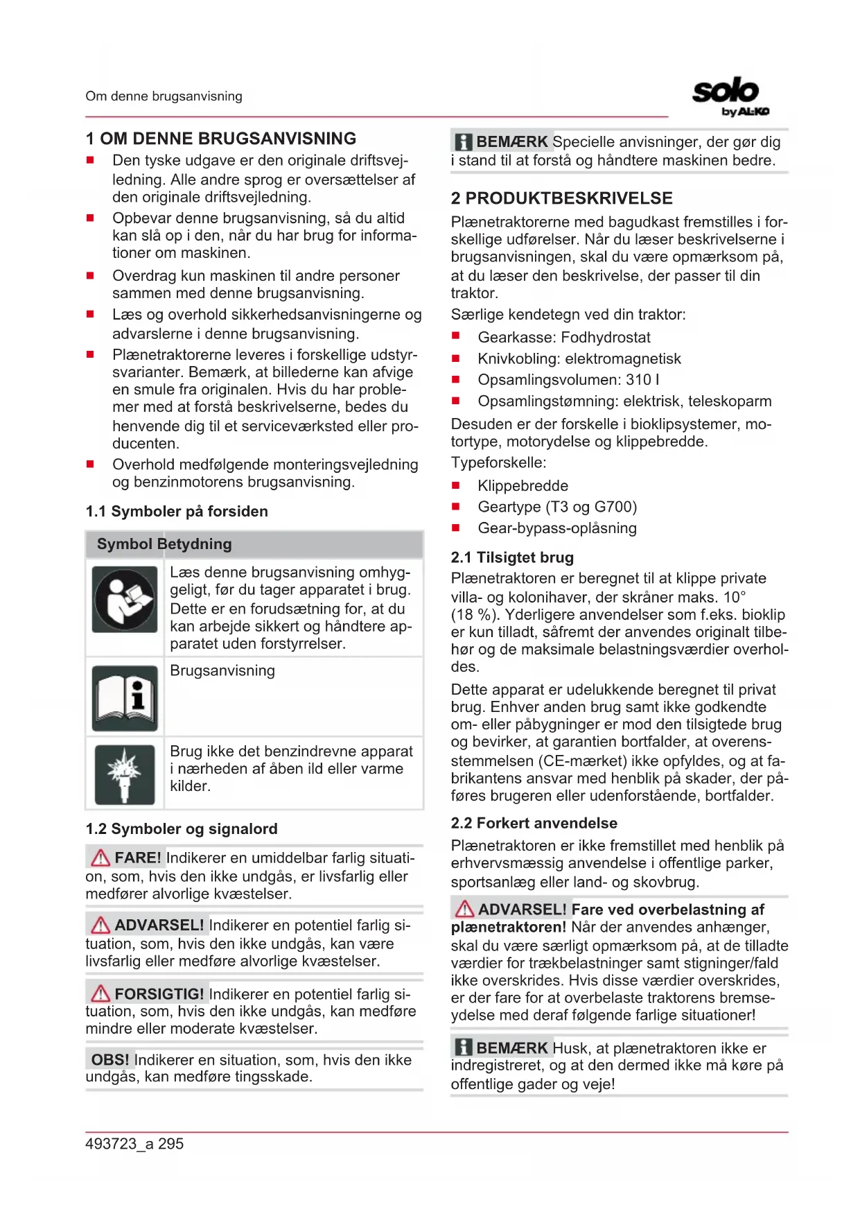 Plænetraktoren er ikke fremstillet med henblik på erhvervsmæssig anvendelse i offentlige parker, sportsanlæg eller land- og skovbrug. ADVARSEL! Fare ved overbelastning af plænetraktoren! Når der anvendes anhænger, skal du være særligt opmærksom på, at de tilladte værdier for trækbelastninger samt stigninger/fald ikke overskrides. Hvis disse værdier overskrides, er der fare for at overbelaste traktorens bremse- ydelse med deraf følgende farlige situationer! BEMÆRK Husk, at plænetraktoren ikke er indregistreret, og at den dermed ikke må køre på offentlige gader og veje!DK 296 493723_a Produktbeskrivelse