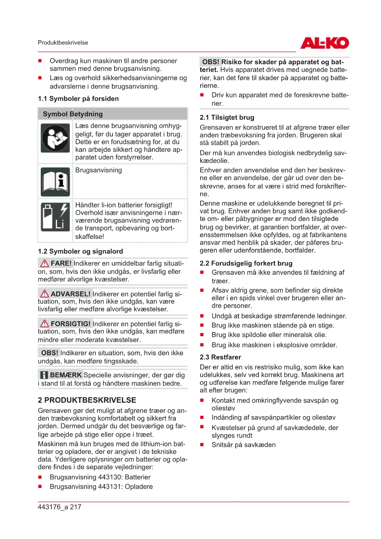 FARE! Indikerer en umiddelbar farlig situati- on, som, hvis den ikke undgås, er livsfarlig eller medfører alvorlige kvæstelser. ADVARSEL! Indikerer en potentiel farlig si- tuation, som, hvis den ikke undgås, kan være livsfarlig eller medføre alvorlige kvæstelser. FORSIGTIG! Indikerer en potentiel farlig si- tuation, som, hvis den ikke undgås, kan medføre mindre eller moderate kvæstelser. OBS! Indikerer en situation, som, hvis den ikke undgås, kan medføre tingsskade. BEMÆRK Specielle anvisninger, der gør dig i stand til at forstå og håndtere maskinen bedre. 2 PRODUKTBESKRIVELSE Grensaven gør det muligt at afgrene træer og an- den træbevoksning komfortabelt og sikkert fra jorden. Dermed undgår du det besværlige og far- lige arbejde på stige eller oppe i træet. Maskinen må kun bruges med de lithium-ion bat- terier og opladere, der er angivet i de tekniske data. Yderligere oplysninger om batterier og opla- dere findes i de separate vejledninger: