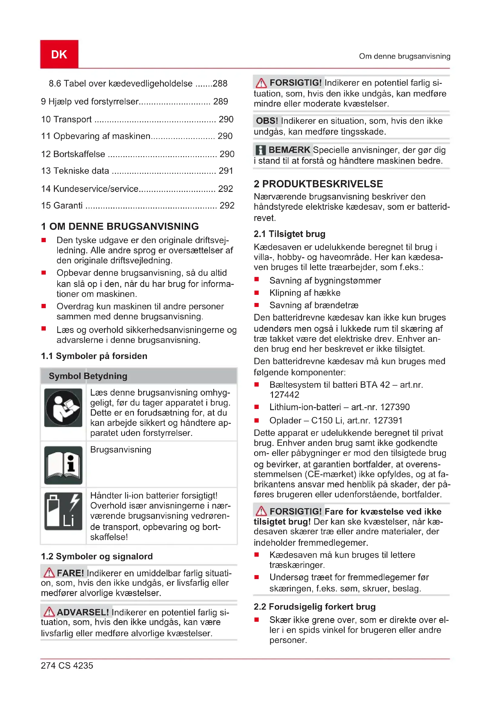 Sluk for apparatet, og fjern batteriet! BEMÆRK Henvend dig til vores kundeser- vice ved forstyrrelser, der ikke er anført i denne tabel, eller som du ikke selv kan afhjælpe. Fejl Årsag Afhjælpning Motoren kører ikke. Der er ingen batterispæn- ding. Lad en elektriker kontrollere strøm- forsyningen. Overbelastningssikringen har slået fra. Vent, indtil overbelastningssikringen genopretter strømforsyningen. Kædebremse tilsluttet. Løsn kædebremsen. Styreskinnen og savkæden bliver varme. Røgudvikling. Savkæden er for stram. Løsn kædespændingen. Olietanken er tom. Fyld savkædeolie i. Kontroller olietanken for beskadigel- ser. Olieindløbet og/eller noten i styreskinnen er snavsede. Rengør olieindløbet og noten i styre- skinnen. Motoren kører, men savkæden bevæger sig ikke. Savkæden er for stram. Løsn kædespændingen. Fejl i maskinen Opsøg fabrikantens serviceværk- sted. Savkæden frembringer træ- støv i steder for træspåner. Kædesaven skal trykkes gen- nem træet. Savkæden er stump. Slib savkæden, eller opsøg fabrikan- tens serviceværksted. Maskinen vibrerer usædvan- ligt. Fejl i maskinen Opsøg fabrikantens serviceværk- sted.DK 290 CS 4235 Transport 10 TRANSPORT ADVARSEL! Livsfare samt fare for alvor- lige kvæstelser. En kørende savkæde kan med- føre meget alvorlige kvæstelser samt være livs- farligt under en transport.