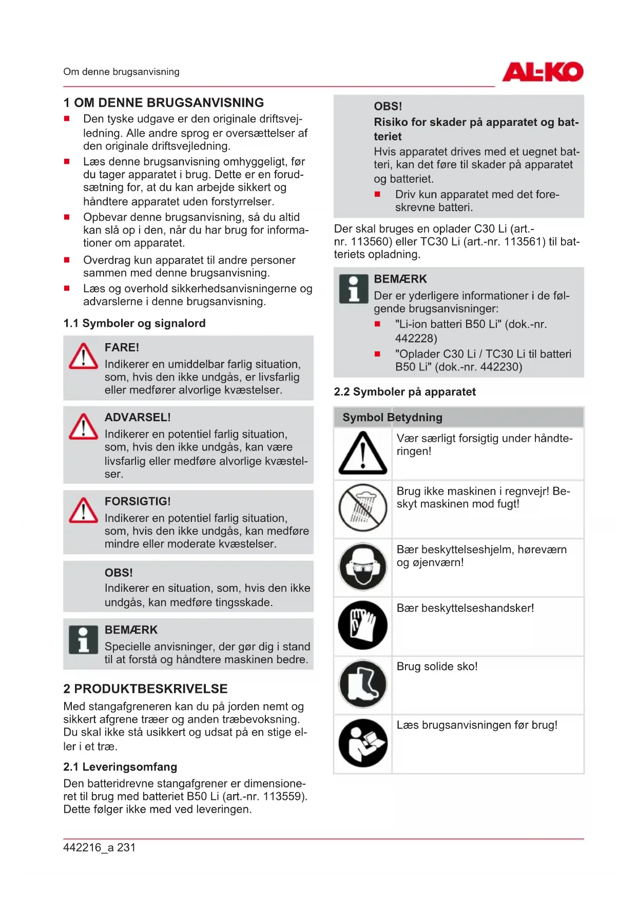 Sæt batte- riet i igen. Motoren kø- rer med af- brydelser Tænd-/sluk- knappen er defekt. Kontakt AL-KO- servicested. Forstyrrelse Årsag Afhjælpning Styreskinnen og savkæden bliver varme. Røgudvikling. Savkæden er for stram. Kontroller kæ- destramningen. Efterspænd sav- kæden. Olietanken er tom. Fyld savkædeo- lie i. Olieadgangs- boringen og/ eller noten i styreskinnen er snavsede. Rengør oliead- gangsboringen og noten i styre- skinnen. Motor i gang, men savkæ- den bevæger sig ikke. Savkæden er for stram. Kontroller kæ- destramningen. Efterspænd sav- kæden. Fejl i appara- tet Kontakt AL-KO- servicested. Savkæden frembringer træstøv i ste- der for træspå- ner. Stangaf- greneren skal trykkes gen- nem træet. Savkæden er stump. Slib savkæden, eller opsøg AL- KO serviceafde- lingen. Apparatet vi- brerer usæd- vanligt. Fejl i appara- tet Kontakt AL-KO- servicested. Batteriets driftstid falder tydeligt. Batteriets le- vetid er udlø- bet. Udskift batteriet. Brug kun origi- nalt tilbehør fra producenten. Batteriet kan ikke oplades. Batteriets kontakter er snavsede. Kontakt AL-KO- servicested. Batteriet el- ler oplade- ren er de- fekt. Udskift batteriet eller opladeren. Brug kun origi- nalt tilbehør fra producenten. Batteriet er for varmt. Lad batteriet kø- le af. BEMÆRK Ved forstyrrelser, der ikke er anført i denne ta- bel, eller som du ikke selv kan afhjælpe, be- des du henvende dig til vores kundeservice.442216_a 245 Garanti 14 GARANTI Inden for den lovbestemte reklamationsperiode reparerer eller udskifter vi efter eget skøn eventuelle materiale- eller fabrikationsfejl på apparatet. Reklamationsperioden bestemmes af loven i det land, hvor maskinen er købt. Vores garanti gælder kun, hvis: