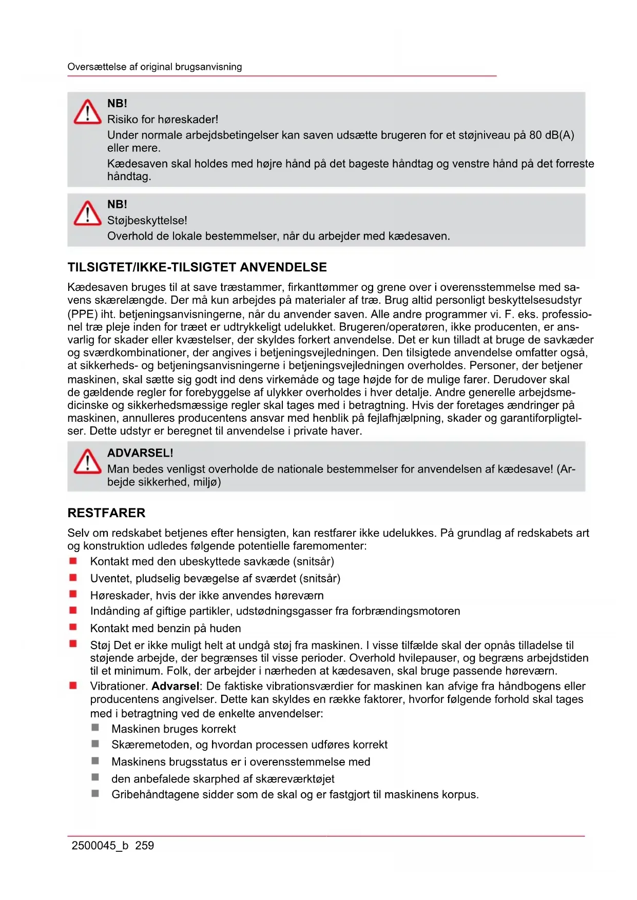 Kædesaven bruges til at save træstammer, firkanttømmer og grene over i overensstemmelse med sa- vens skærelængde. Der må kun arbejdes på materialer af træ. Brug altid personligt beskyttelsesudstyr (PPE) iht. betjeningsanvisningerne, når du anvender saven. Alle andre programmer vi. F. eks. professio- nel træ pleje inden for træet er udtrykkeligt udelukket. Brugeren/operatøren, ikke producenten, er ans- varlig for skader eller kvæstelser, der skyldes forkert anvendelse. Det er kun tilladt at bruge de savkæder og sværdkombinationer, der angives i betjeningsvejledningen. Den tilsigtede anvendelse omfatter også, at sikkerheds- og betjeningsanvisningerne i betjeningsvejledningen overholdes. Personer, der betjener maskinen, skal sætte sig godt ind dens virkemåde og tage højde for de mulige farer. Derudover skal de gældende regler for forebyggelse af ulykker overholdes i hver detalje. Andre generelle arbejdsme- dicinske og sikkerhedsmæssige regler skal tages med i betragtning. Hvis der foretages ændringer på maskinen, annulleres producentens ansvar med henblik på fejlafhjælpning, skader og garantiforpligtel- ser. Dette udstyr er beregnet til anvendelse i private haver. ADVARSEL! Man bedes venligst overholde de nationale bestemmelser for anvendelsen af kædesave! (Ar- bejde sikkerhed, miljø) RESTFARER Selv om redskabet betjenes efter hensigten, kan restfarer ikke udelukkes. På grundlag af redskabets art og konstruktion udledes følgende potentielle faremomenter: Kontakt med den ubeskyttede savkæde (snitsår) Uventet, pludselig bevægelse af sværdet (snitsår) Høreskader, hvis der ikke anvendes høreværn Indånding af giftige partikler, udstødningsgasser fra forbrændingsmotoren Kontakt med benzin på huden Støj Det er ikke muligt helt at undgå støj fra maskinen. I visse tilfælde skal der opnås tilladelse til støjende arbejde, der begrænses til visse perioder. Overhold hvilepauser, og begræns arbejdstiden til et minimum. Folk, der arbejder i nærheden at kædesaven, skal bruge passende høreværn. Vibrationer. Advarsel: De faktiske vibrationsværdier for maskinen kan afvige fra håndbogens eller producentens angivelser. Dette kan skyldes en række faktorer, hvorfor følgende forhold skal tages med i betragtning ved de enkelte anvendelser: Maskinen bruges korrekt Skæremetoden, og hvordan processen udføres korrekt Maskinens brugsstatus er i overensstemmelse med den anbefalede skarphed af skæreværktøjet Gribehåndtagene sidder som de skal og er fastgjort til maskinens korpus.da Delenes placering 260 2500045_b Hvis du bemærker en ubehagelig følelse på huden, eller hvis dine hænder misfarves, mens du bruger maskinen. Indlæg passende arbejdspauser. Hvis der ikke indlægges passende arbejdspauser, kommer du muligvis til at lide af "hvide fingre". DELENES PLACERING