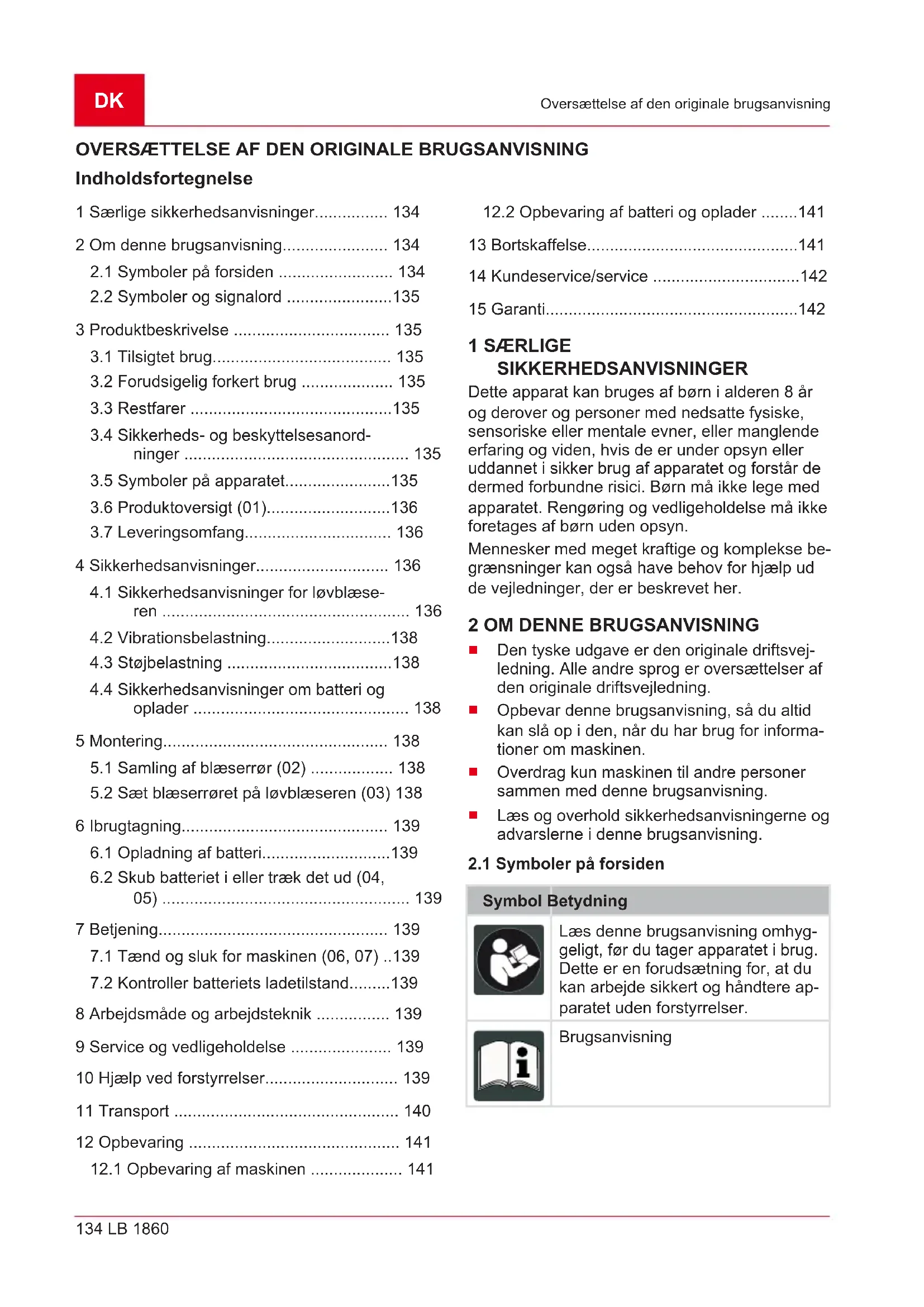 Ejeren eller brugeren af batterier og genopla- delige batterier er forpligtet til at tilbagesende redskabet efter brug iht. loven. ReturneringenDK 142 LB 1860 Kundeservice/service er begrænset til en normal husholdnings- mængde. Udtjente batterier kan indeholde skadelige stoffer eller tungmetaller, som skader miljøet samt men- neskers sundhed. Genbruges udtjente batterier samt de indeholdte ressourcer, er dette med til at beskytte vigtige ressourcer. Symbolet på en overstreget affaldsspand bety- der, at batterier og genopladelige batterier ikke må smides ud med det almindelige husholdnings- affald. Står tegnene Hg, Cd eller Pb under affaldsspan- den, betyder dette følgende: