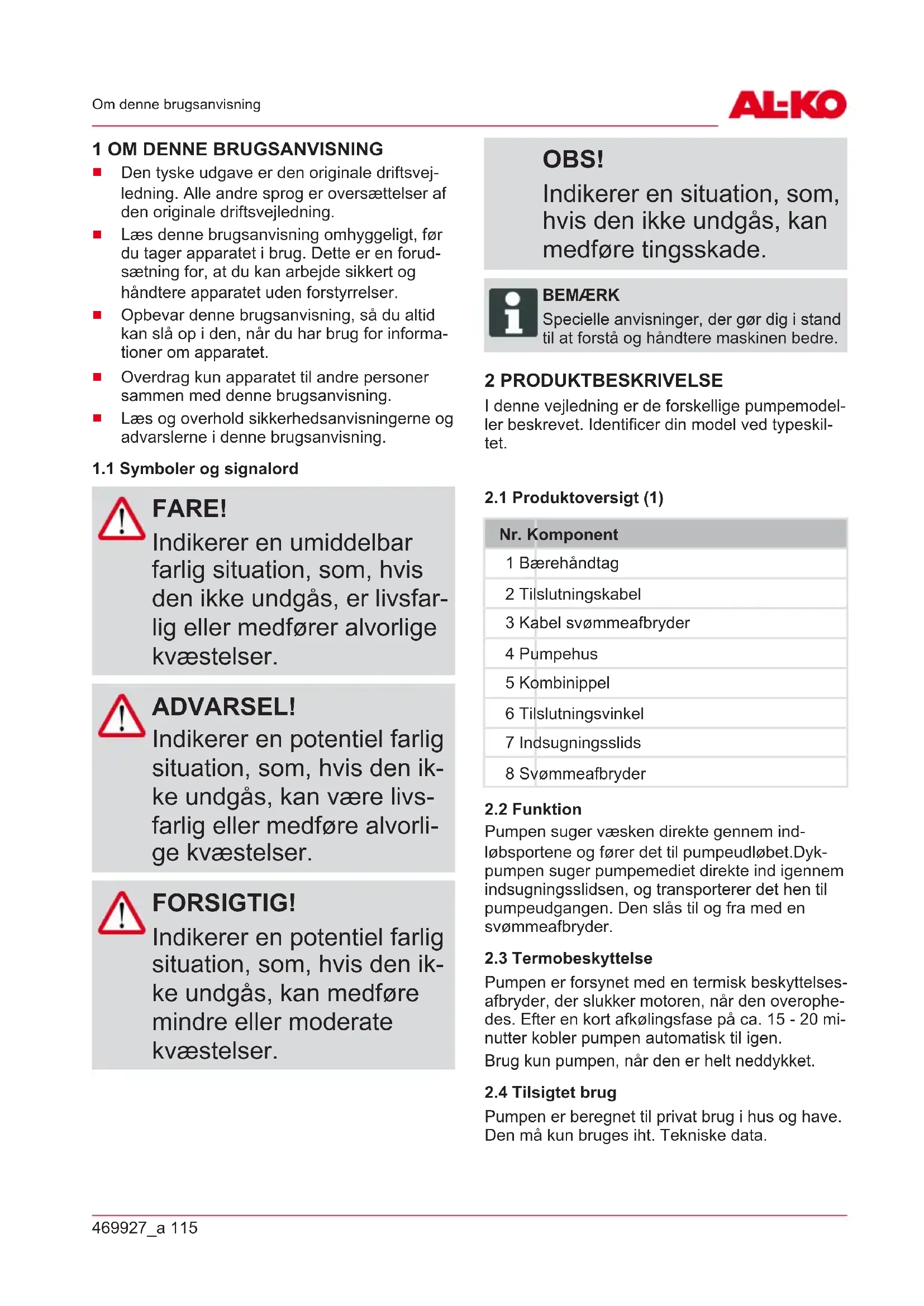 FARE! Indikerer en umiddelbar farlig situation, som, hvis den ikke undgås, er livsfar- lig eller medfører alvorlige kvæstelser. ADVARSEL! Indikerer en potentiel farlig situation, som, hvis den ik- ke undgås, kan være livs- farlig eller medføre alvorli- ge kvæstelser. FORSIGTIG! Indikerer en potentiel farlig situation, som, hvis den ik- ke undgås, kan medføre mindre eller moderate kvæstelser. OBS! Indikerer en situation, som, hvis den ikke undgås, kan medføre tingsskade. BEMÆRK Specielle anvisninger, der gør dig i stand til at forstå og håndtere maskinen bedre. 2 PRODUKTBESKRIVELSE I denne vejledning er de forskellige pumpemodel- ler beskrevet. Identificer din model ved typeskil- tet.