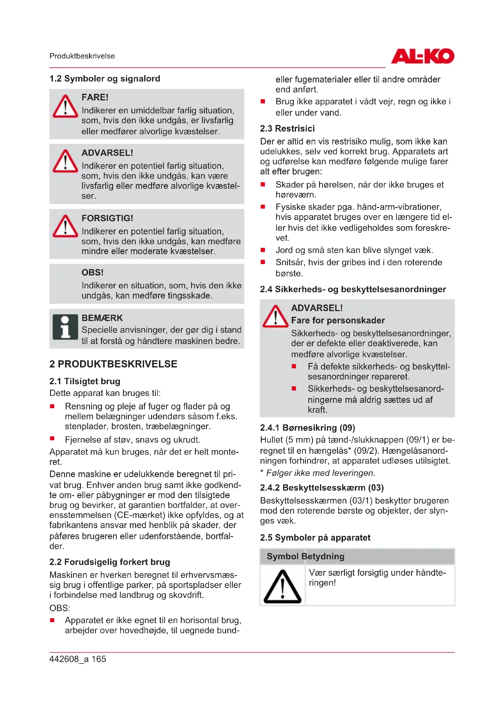 Symbol Betydning Vær særligt forsigtig under håndte- ringen!DK 166 MB 2010 Produktbeskrivelse Symbol Betydning Læs brugsanvisningen før brug! Fare ved bortslyngede genstande! Hold uvedkommende væk fra fare- området! Hold hænder og fødder væk fra den roterende børste! Bær øjenværn! Beskyt apparatet mod regn og fugt!