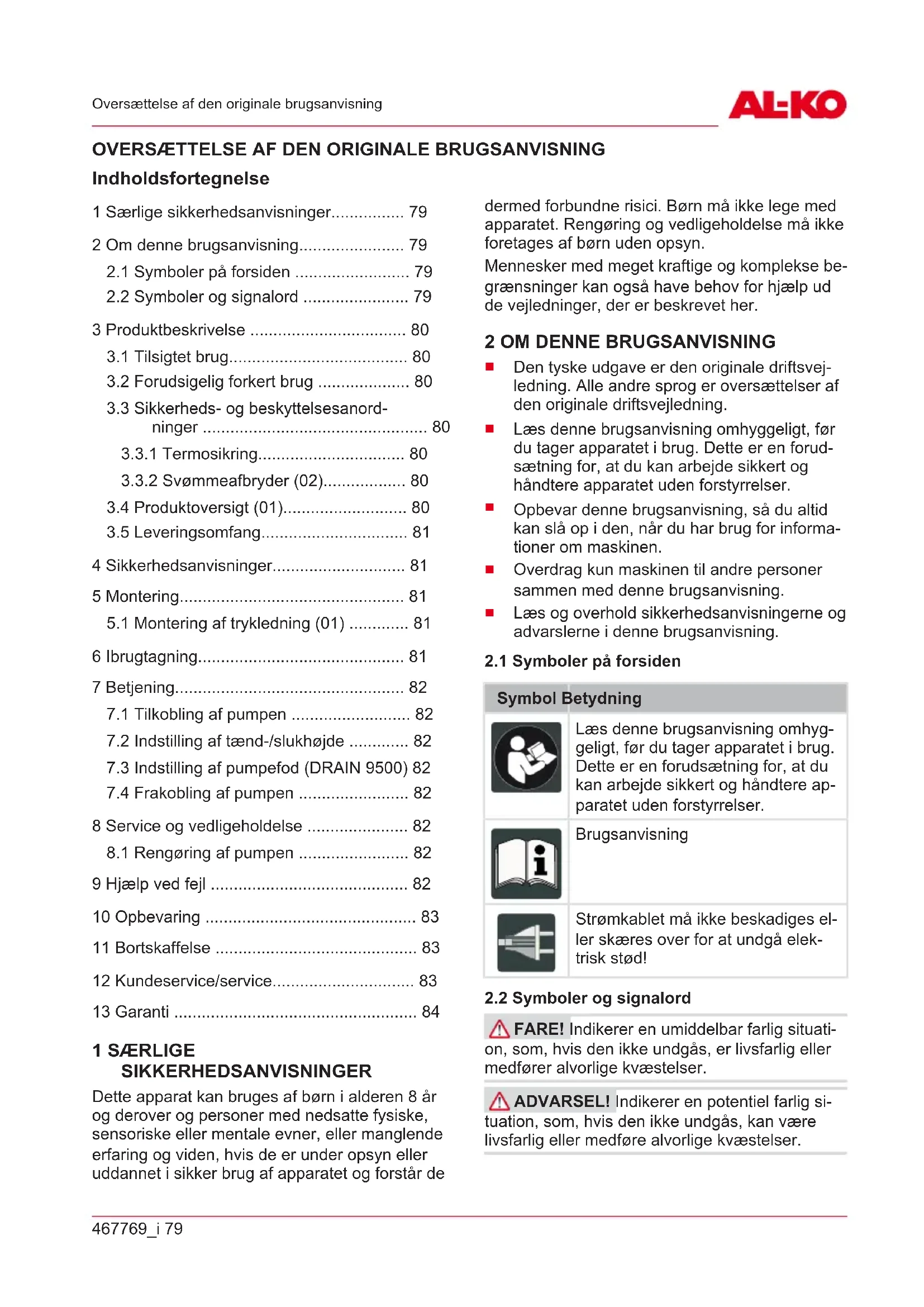 Lad en elektriker afhjælpe fejl i det elektriske system. BEMÆRK Ved fejl, der ikke kan afhjælpes, rettes henvendelse til vores kundeservice.467769_i 83 Opbevaring Forstyrrelse Mulig årsag Afhjælpning Motoren kø- rer ikke. Pumpehjul blokeret. Fjern urenheder i indsugnings- området. Ren- gør åbningen i motorhuset bag- ved med egnet værktøj. Den termisk beskyttelses- afbryder har slået fra. Vent, indtil den termisk beskyt- telsesafbryder slår pumpen til igen. Vær op- mærksom på pumpemediets maks. tempera- tur. Tjek pum- pen. Ingen nets- pænding. Kontroller sikrin- gerne, lad en elektriker kon- trollere strømfor- syningen. Svømmeaf- bryder reage- rer ikke, selv om vandstan- den stiger. Send pumpen til AL-KO-service. Pumpen kø- rer, men pumper ikke. Luft i pumpe- huset. Udluft pumpen ved at holde den skråtstillet. Tilstopning på sugesiden. Fjern urenheder i indsugnings- området. Trykledning lukket. Åbn tryklednin- gen. Trykslange bøjet. Ret trykslangen ud. Forstyrrelse Mulig årsag Afhjælpning Volumen- strømmen er for lille Slangediame- teren er for lil- le. Brug en større slangediameter. Tilstopning på sugesiden. Fjern urenheder i indsugnings- området. Transporthøj- den er for stor. Overhold maks. transporthøjde, se de tekniske data! 10 OPBEVARING BEMÆRK Hvis der er fare for frost, skal sy- stemet tømmes fuldstændigt og pumpen opbeva- res på et frostsikkert sted. 11 BORTSKAFFELSE Elektrisk og elektronisk udstyr må ikke smi- des ud med det almindelige husholdnings- affald, men skal bortskaffes særskilt! Emballage, udstyr og tilbehør er fremstillet af genanvendelige materialer og skal bortskaffes på behørig vis. 12 KUNDESERVICE/SERVICE Henvend dig til nærmeste AL-KOserviceværk- sted ved spørgsmål til garanti, reparation eller re- servedele. Serviceværksteder findes på internet- tet på adressen: www.al-ko.com/service-contactsDK