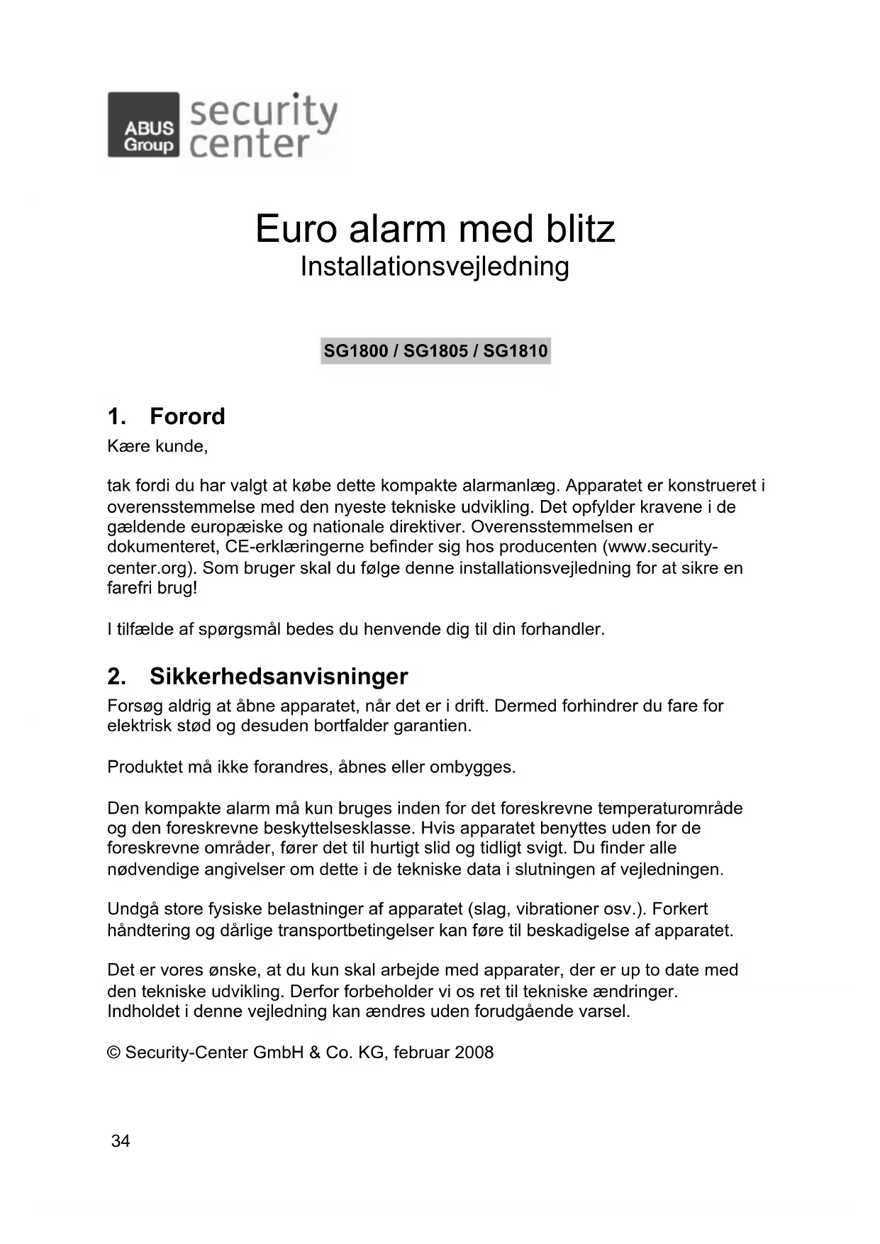 Forsøg aldrig at åbne apparatet, når det er i drift. Dermed forhindrer du fare for elektrisk stød og desuden bortfalder garantien. Produktet må ikke forandres, åbnes eller ombygges. Den kompakte alarm må kun bruges inden for det foreskrevne temperaturområde og den foreskrevne beskyttelsesklasse. Hvis apparatet benyttes uden for de foreskrevne områder, fører det til hurtigt slid og tidligt svigt. Du finder alle nødvendige angivelser om dette i de tekniske data i slutningen af vejledningen. Undgå store fysiske belastninger af apparatet (slag, vibrationer osv.). Forkert håndtering og dårlige transportbetingelser kan føre til beskadigelse af apparatet. Det er vores ønske, at du kun skal arbejde med apparater, der er up to date med den tekniske udvikling. Derfor forbeholder vi os ret til tekniske ændringer. Indholdet i denne vejledning kan ændres uden forudgående varsel. © Security-Center GmbH & Co. KG, februar 2008 Euro alarm med blitz Installationsvejledning SG1800 / SG1805 / SG181035