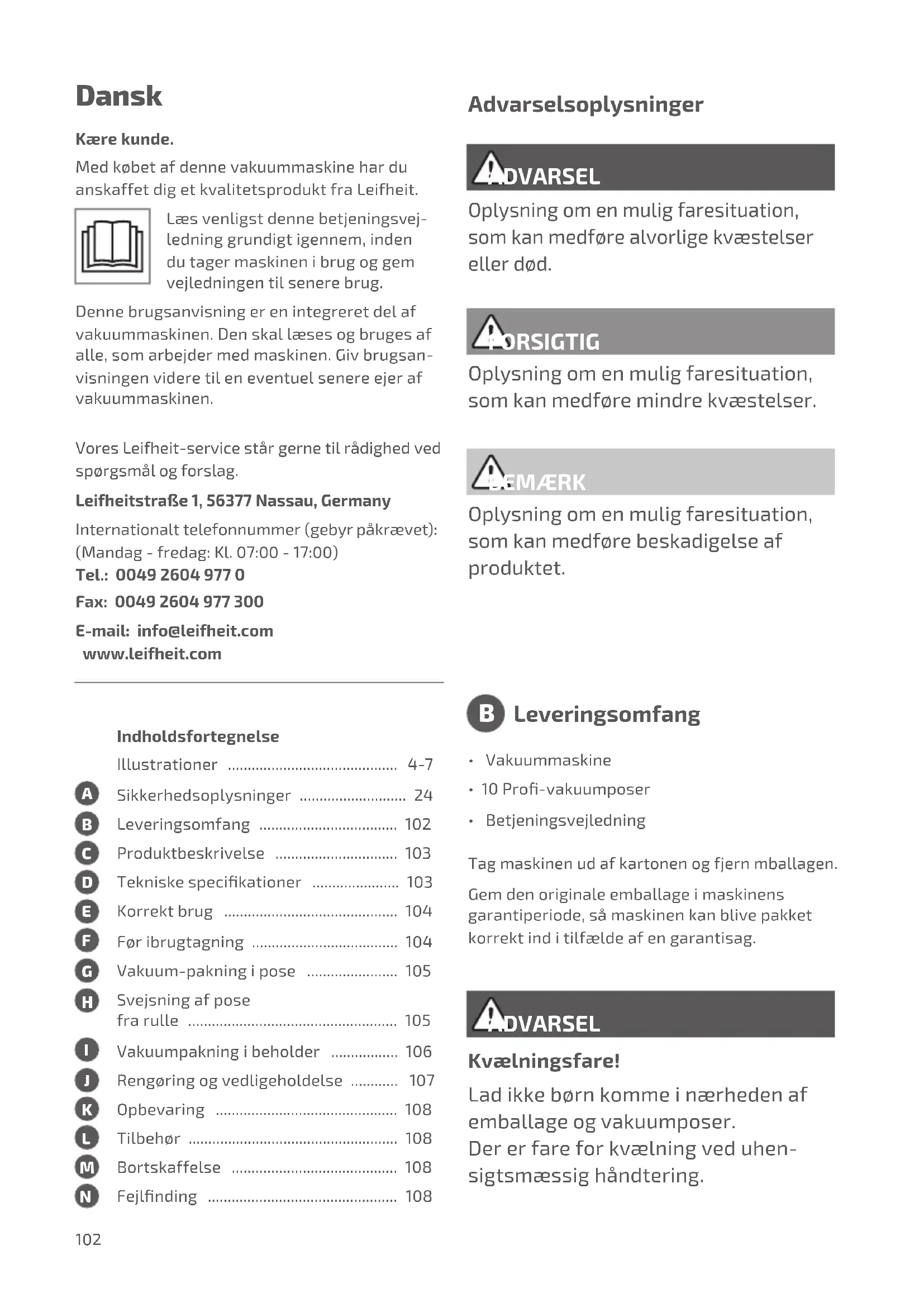 Leveringsomfang FORSIGTIG Oplysning om en mulig faresituation, som kan medføre mindre kvæstelser. BEMÆRK Oplysning om en mulig faresituation, som kan medføre beskadigelse af produktet. Vores Leifheit-service står gerne til rådighed ved spørgsmål og forslag. Leifheitstraße 1, 56377 Nassau, Germany Internationalt telefonnummer (gebyr påkrævet): (Mandag - fredag: Kl. 07:00 - 17:00) Tel.: 0049 2604 977 0 Fax: 0049 2604 977 300 E-mail: info@leifheit.com www.leifheit.com103 [4] Teonbelagt varmeelement Dette element opvarmer og forsegler posen. [5] Forseglingsstrimler Forseglingsstrimmel til forsegling af posen. [6] Øverste tætningsliste Vakuumerer, idet den skaber et vakuum- kammer med den nederste tætningsliste. [7] Nederste tætningsliste Danner et vakuumkammer sammen med den øverste tætningsliste. [8] Vakuumkammer I vakuumkammeret suges luften ud af posen og overskydende væske opsamles. [9] Tilslutning til vakuumering i beholdere Tilslutning til slangetilbehør til vakuumering af beholdere. [10] Sikkerhedskrog Låser maskinens låg. [11] Udløserknap Findes på hver sin side af maskinen. Når begge knapper trykkes ned samtidig, åbnes låget og undertrykket i maskinen udledes. [12] Strømstik Model ......................................... Vacu Power 100 Spænding ...................................... 220-240V, 50Hz Strømforbrug .................................. 80 W Vakuumværdi .................................. 50 Kpa Produktmål .................................... 378 x 103 x 66 mm Vægt .......................................... 1,0 kg [1] PULSE-knap med indikator Denne knap bruges til manuel styring af vakuumpumpen. Når der trykkes på denne knap, starter vakuumeringsprocessen. Når knappen slippes, afsluttes processen. På denne måde er det muligt at vakuume- re trykfølsomme fødevarer på en skånsom måde. Denne proces kan gentages. [2] SEAL-knap med indikator Denne knap har 2 funktioner: a) Svejsning af pose uden vakuumering. En pose kan fremstilles direkte fra en poserulle. b) Når den automatiske vakuumerings- og forseglingsfunktion er aktiveret, stopper denne knap motorpumpen og begynder med det samme at forsegle posen. På den måde kan brugeren reducere det indvendi- ge tryk i posen og således undgå at mase skrøbelige fødevarer. Denne knap virker kun, når maskinens låg er lukket helt. [3] AUTO-knap med indikator Denne knap starter den automatiske vakuumering og svejsning af posen.