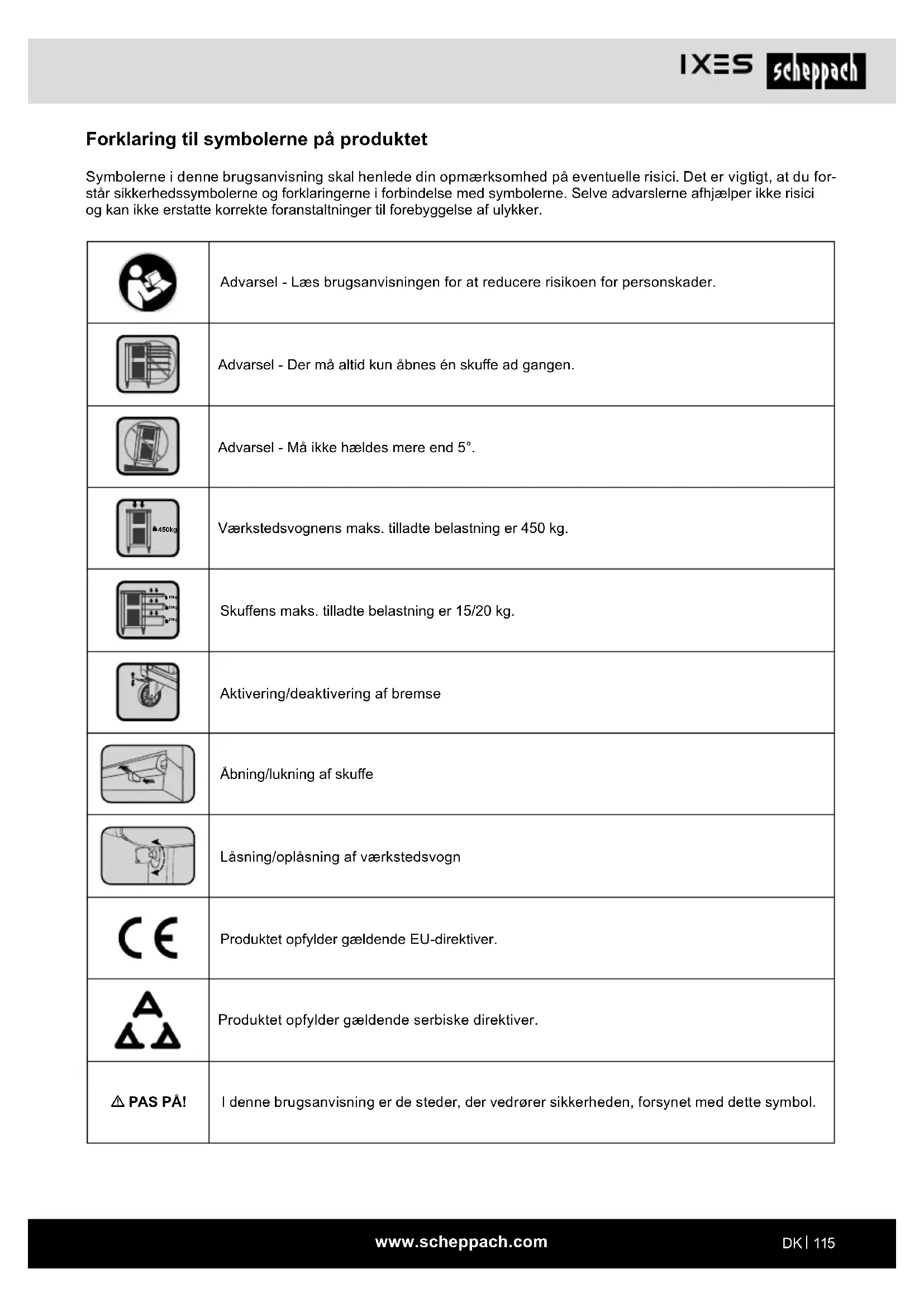 Forklaring til symbolerne på produktet Symbolerne i denne brugsanvisning skal henlede din opmærksomhed på eventuelle risici. Det er vigtigt, at du for- står sikkerhedssymbolerne og forklaringerne i forbindelse med symbolerne. Selve advarslerne afhjælper ikke risici og kan ikke erstatte korrekte foranstaltninger til forebyggelse af ulykker. Advarsel - Læs brugsanvisningen for at reducere risikoen for personskader. Advarsel - Der må altid kun åbnes én skue ad gangen. Advarsel - Må ikke hældes mere end 5°. 450kg Værkstedsvognens maks. tilladte belastning er 450 kg. 15kg 20kg 20kg Skuens maks. tilladte belastning er 15/20 kg. Aktivering/deaktivering af bremse Åbning/lukning af skue Låsning/oplåsning af værkstedsvogn Produktet opfylder gældende EU-direktiver. Produktet opfylder gældende serbiske direktiver. m PAS PÅ! I denne brugsanvisning er de steder, der vedrører sikkerheden, forsynet med dette symbol.www.scheppach.com