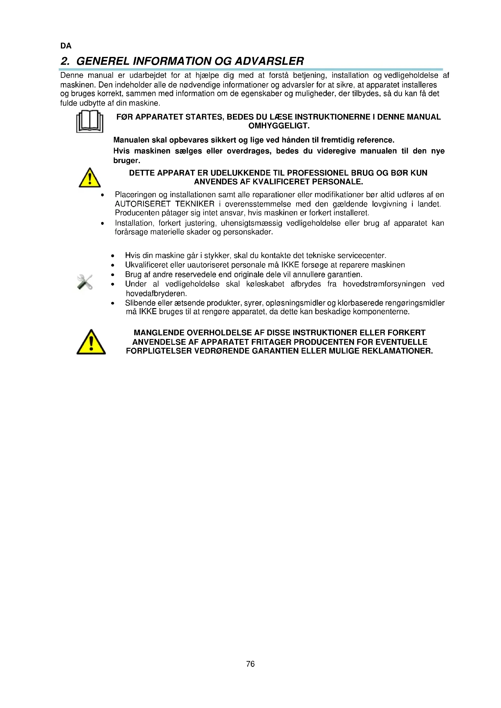Denne manual er udarbejdet for at hjælpe dig med at forstå betjening, installation og vedligeholdelse af maskinen. Den indeholder alle de nødvendige informationer og advarsler for at sikre, at apparatet installeres og bruges korrekt, sammen med information om de egenskaber og muligheder, der tilbydes, så du kan få det fulde udbytte af din maskine.