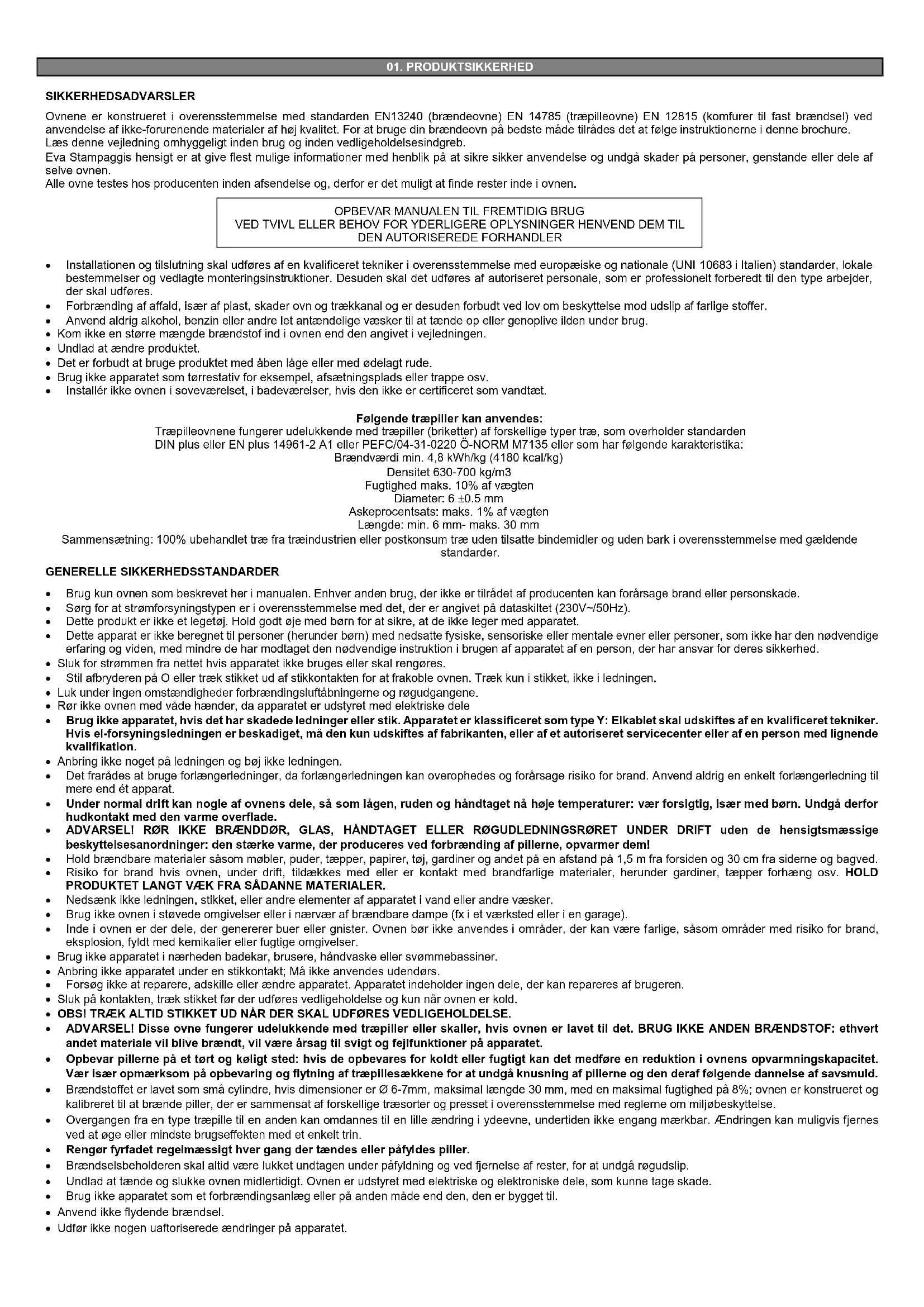 Følgende træpiller kan anvendes: Træpilleovnene fungerer udelukkende med træpiller (briketter) af forskellige typer træ, som overholder standarden DIN plus eller EN plus 14961-2 A1 eller PEFC/04-31-0220 Ö-NORM M7135 eller som har følgende karakteristika: Brændværdi min. 4,8 kWh/kg (4180 kcal/kg) Densitet 630-700 kg/m3 Fugtighed maks. 10% af vægten Diameter: 6 ±0.5 mm Askeprocentsats: maks. 1% af vægten Længde: min. 6 mm- maks. 30 mm Sammensætning: 100% ubehandlet træ fra træindustrien eller postkonsum træ uden tilsatte bindemidler og uden bark i overensstemmelse med gældende standarder. GENERELLE SIKKERHEDSSTANDARDER Brug kun ovnen som beskrevet her i manualen. Enhver anden brug, der ikke er tilrådet af producenten kan forårsage brand eller personskade.
