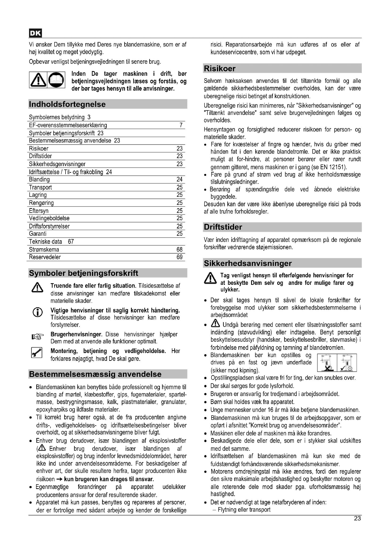 Længere tilslutningsledninger forårsager spændingsfald. Motoren opnår ikke mere sin maksimale effekt, maskinfunktionen reduceres. Ved brug af en kabeltromle skal kablet afvikles helt. Tilslutningsledninger må ikke anvendes til formål, de ikke er beregnet til. Beskyt kablet mod varme, olie og skarpe kanter. Tag ikke fat i tilslutningsledningen når stikket skal tages ud. Tilslutningsledningerne skal før brugen undersøges for beskadigede steder eller deres alder. Der må aldrig bruges beskadigede tilslutningsledninger. Ved trækningen af tilslutningsledningen skal tages hensyn til, at den ikke bliver knust, knækket eller at stikforbindelsen ikke bliver våd. Der må ikke bruges provisoriske elektrotilslutninger. Ved beskyttelsesindretninger må aldrig bruges brokontakt eller tages ud af drift. Skal tilsluttes via fejlstrømsrelæ (30 mA). Elektrotilslutningen henholdsvis reparationer ved elektro- tilslutningen skal gennemføres af en elektrofagmand med koncession. Herved skal der tages hensyn til de lokale forskrifter, især beskyttelsesforholdene. Reparationer ved elektriske dele af maskinen skal gennemføres af producenten hhv. af firmaer foreslået af producenten. Anvend kun originale reservedele. Ved anvendelse af andre reservedele og andet tilbehør kan brugeren komme i fare. For heraf resulterende skader overtager producenten intet ansvar. Idriftsættelse Tag hensyn til alle sikkerhedsforskrifter. Opstilling af maskinen: Maskinen skal opstilles på fast og jævn unterlag. Maskinens nedsynkning i jorden skal undgås. Tag hensyn til forskrifterne for forebyggelse mod ulykker (kipningsfare). Ved maskinens opstilling bør tages hensyn til at blandetromlen kan tømmes uden hindringer. Til- og frakobling Husk altid at forsikre Dem, at alle beskyttelsesmekanismer på blandemaskinen er korrekt monteret. alle sikkerhedsanvisninger er blevet fulgt. Motoren må kun sættes i drift og tages ud af drift via kontakten. Ved strømafbrydelse kobler maskinen automatisk fra. For at tage maskinen i drift igen bør kontakten trykkes på ny. Motorbeskyttelse Motoren er forsynet med temperaturovervågning. Temperatur- overvågningen kobler motoren automatisk fra ved overbelastning (overhedning). Maskinen kan efter en afkølingspause tages i drift igen. Blanding Blandeanlægget må kun benyttes til de opgaver, der beskrives i afsnittet ”Korrekt brug og anvendelsesområder”. Kontroller at blandeanlægget står på et solidt underlag. Påfyldning og tømning af blandetromlen skal ske, mens motoren er tændt. Vær opmærksom på den korrekte påfyldningsmængde. Sikkerhedsafbryderen forhindrer drift i forbindelse med åbent beskyttelsesgitter. Kontroller sikkerhedsfunktionen inden blan- deren tages i brug. Fremstilling af blandingsmaterialer: