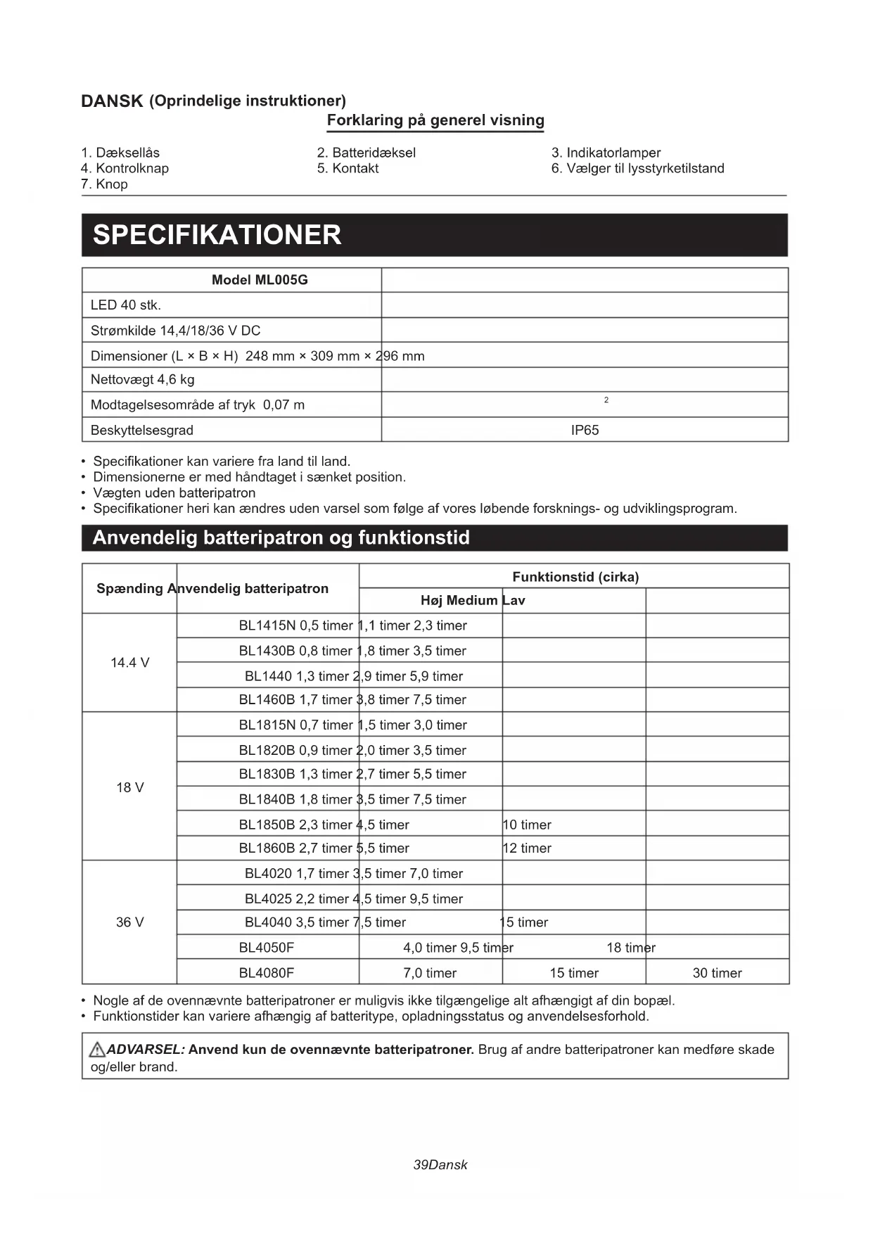 ML005G - Belysning MAKITA - Gratis brugsanvisning og manual