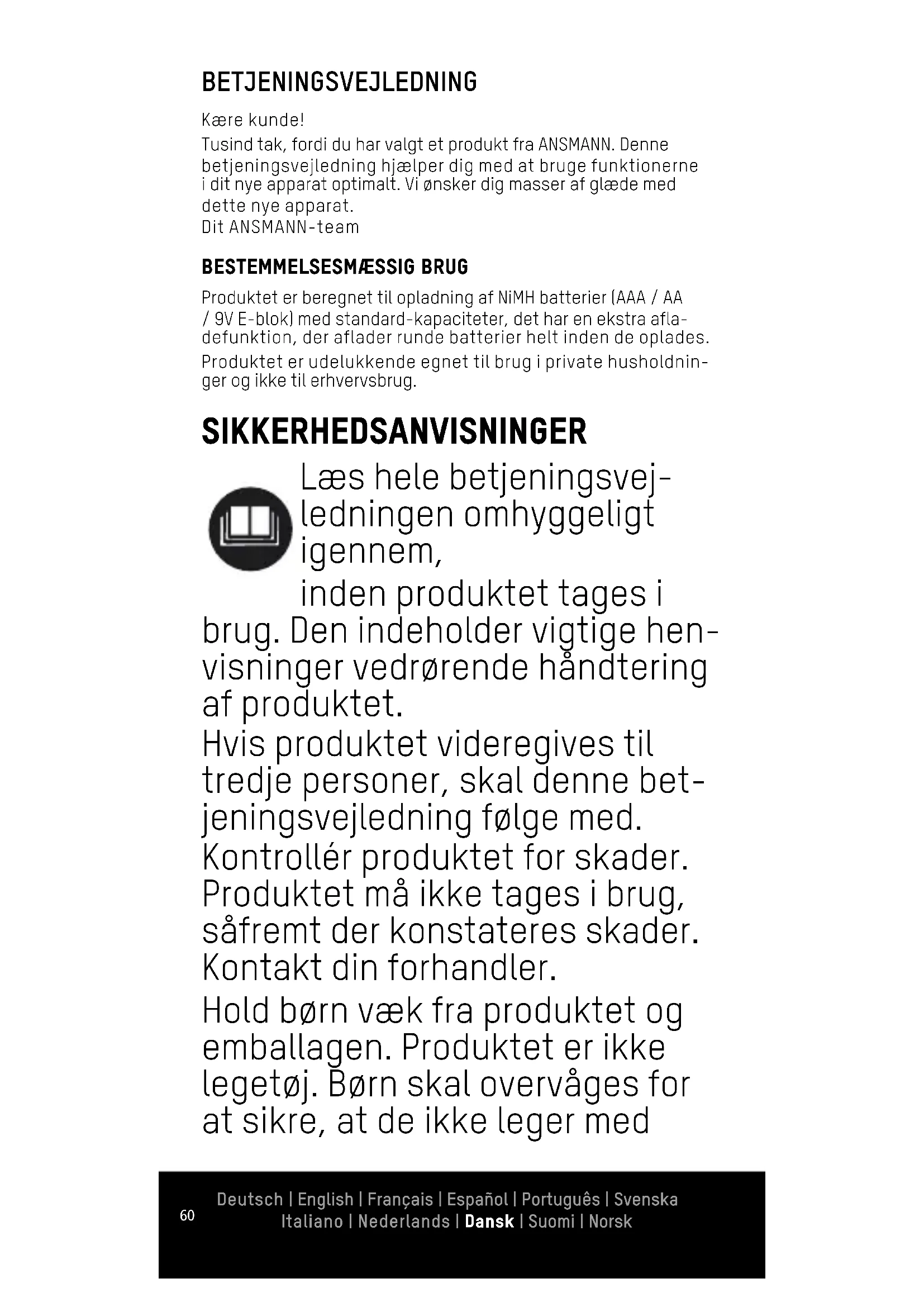 Rengøring Hver gang inden rengøring skal strømforsyningen til produktet afbrydes og batterierne fjernes. Til rengøring anvendes kun en blød, tør eller let fugtet klud (evt. med lidt blidt opvaskemiddel) Brug aldrig skure- eller opløsningsnidler. TEKNISKE DATA Strømforsyning 100-240V AC Ladeslidser 4x cylindriske celler, 1x 9V E-blok Ladestrøm AA: 650mA / AAA: 350mA / 9V E-blok 15mA Konserveringsstrøm AA: 10mA / AAA: 5mA / 9V E-blok 1,3mA Deutsch | English | Français | Español | Português | Svenska Italiano | Nederlands | Dansk | Suomi | Norsk65 Deutsch | English | Français | Español | Português | Svenska Italiano | Nederlands | Dansk | Suomi | Norsk Deutsch | English | Français | Español | Português | Svenska Italiano | Nederlands | Dansk | Suomi | Norsk Egnede batterityper (forskellige typer eller kapaciteter kan kombineres efter behov) Antal Type (NiMH) Maks. ladekapa- citet 1-4 Mignon AA 3000 mAh Micro AAA 1100 mAh 1 9V E-blok 300mAh Ved opladning af en 9V-e-blok kan der i de midterste to slidser til cylindriske batterier ikke oplades batterier. Opladningstidstabel Type Capaciteit Oplaadtijd: ca. 3 uur Laads- trooms- terkte Potlood (AAA) 1000 mAh 800 mAh 4 t 3,25 t 350 mA Penlite (AA) 2650 mAh 2500 mAh 2100 mAh 1300 mAh 5,75 t 5,5 t 4,75 t 3 t 650 mA 9 V E-blok- batterij Tot 300 mAh 24h 15 mA BORTSKAFFELSE Bortskaf produktet iht. lovens regler. Mærkningen ”Skraldespand” henviser til, at gamle elektriske apparater i EU ikke må bortskaffes med dagrenovationen. Brug genbrugs- og indsamlingssystemerne i din kommune, eller kontakt den forhandler, hvor du har købt produktet. Batterier er ressourcer, som ikke må bortskaffes med dagrenovationen. Aflever altid brugte batterier på genbrugs- stationen. På denne måde overholder du loven og yder et bidrag til miljøets beskyttelse.66 Deutsch | English | Français | Español | Português | Svenska Italiano | Nederlands | Dansk | Suomi | Norsk ANSVARSFRASKRIVELSE De oplysninger, som denne betjeningsvejledning indeholder, kan ændres uden forudgående varsel. ANSMANN hæfter ikke for direkte, indirekte, tilfældige eller andre skader eller følgeska- der, der er opstået pga. ukorrekt håndtering eller manglende overholdelse af de informationer, som denne betjeningsvejled- ning indeholder. Ved forkert anvendelse af produktet hæfter vi ikke og yder ingen erstatnings- og garantikrav. GARANTI Vi giver tre års garanti på apparatet. Ved skader på apparatet, der opstår som følge af manglende overholdelse af brugsan- visningen, kan der ikke gives garanti. Dine lovlige garantikrav berøres ikke heraf. Produktet overholder kravene i EU direktiverne. Du finder vores garantibestemmelser online på: www.ans- mann.de Der tages forbehold for tekniske ændringer. Vi hæfter ikke for trykfejl. Produktet overholder kravene i EU direktiverne.67 Deutsch | English | Français | Español | Português | Svenska Italiano | Nederlands | Dansk | Suomi | Norsk