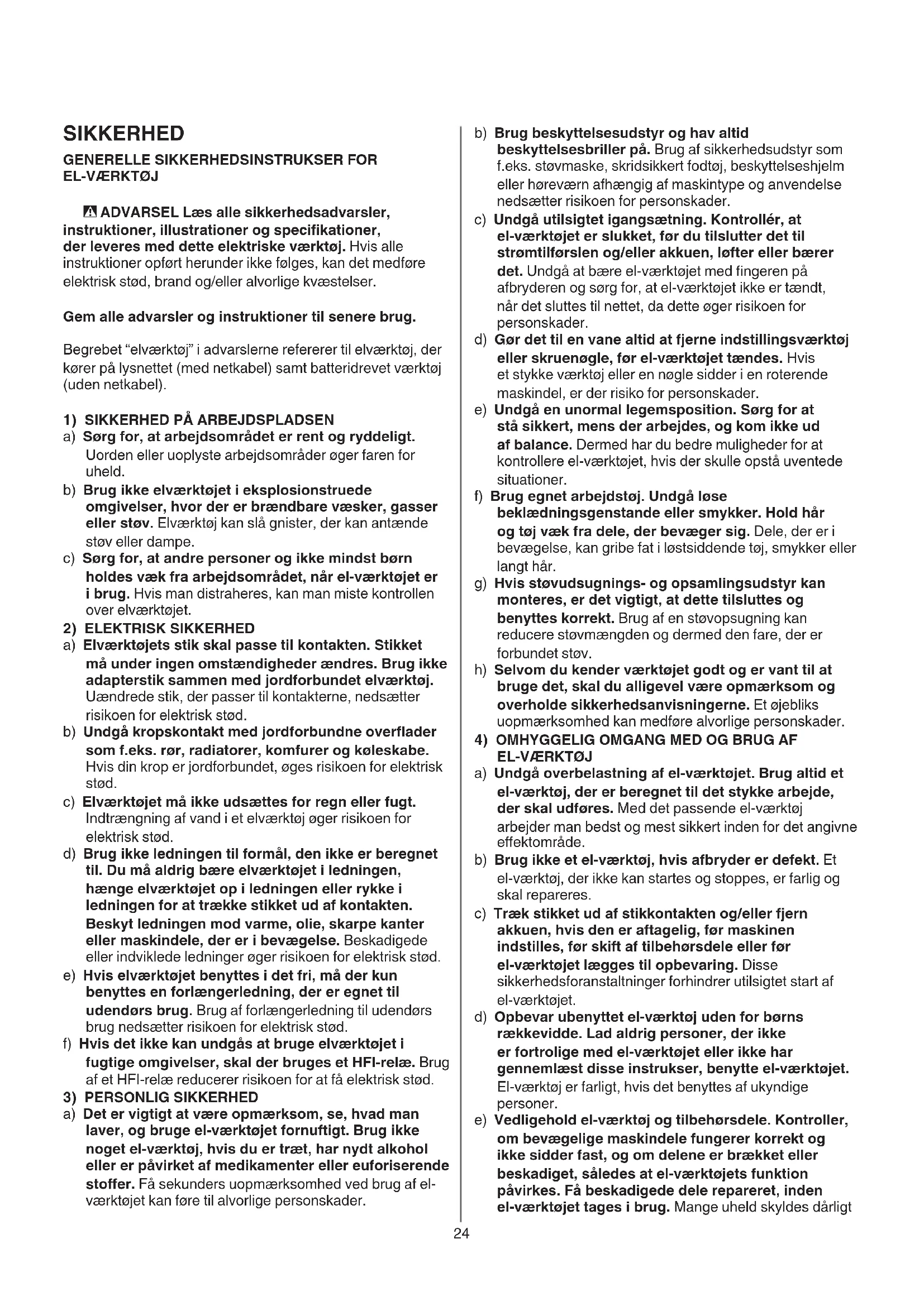 a) Det er vigtigt at være opmærksom, se, hvad man laver, og bruge el-værktøjet fornuftigt. Brug ikke noget el-værktøj, hvis du er træt, har nydt alkohol eller er påvirket af medikamenter eller euforiserende stoer. Få sekunders uopmærksomhed ved brug af el- værktøjet kan føre til alvorlige personskader.25 GENERELT