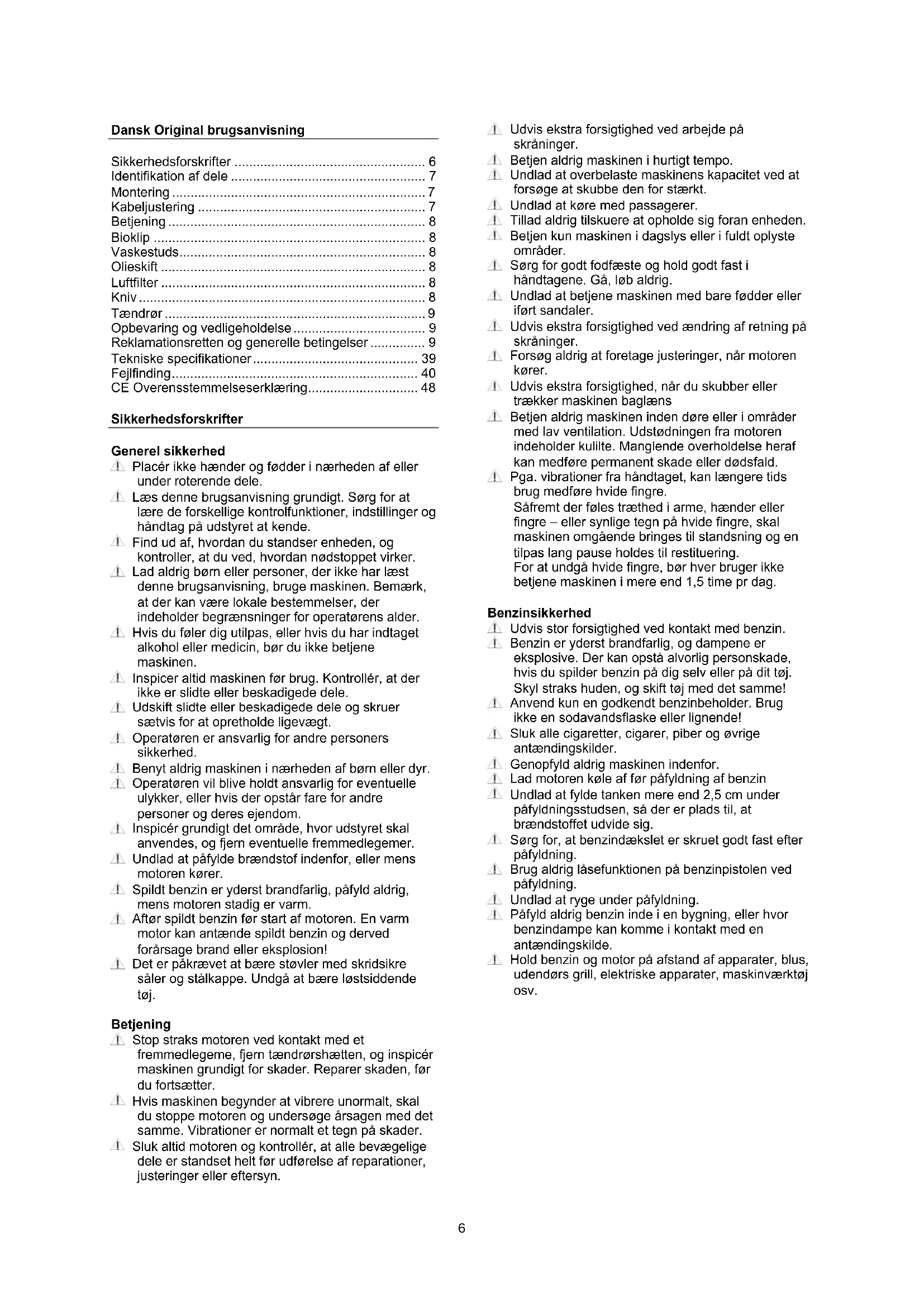 - CE Overensstemmelseserklæring Sikkerhedsforskrifter Generel sikkerhed Placér ikke hænder og fødder i nærheden af eller under roterende dele. Læs denne brugsanvisning grundigt. Sørg for at lære de forskellige kontrolfunktioner, indstillinger og håndtag på udstyret at kende. Find ud af, hvordan du standser enheden, og kontroller, at du ved, hvordan nødstoppet virker. Lad aldrig børn eller personer, der ikke har læst denne brugsanvisning, bruge maskinen. Bemærk, at der kan være lokale bestemmelser, der indeholder begrænsninger for operatørens alder. Hvis du føler dig utilpas, eller hvis du har indtaget alkohol eller medicin, bør du ikke betjene maskinen. Inspicer altid maskinen før brug. Kontrollér, at der ikke er slidte eller beskadigede dele. Udskift slidte eller beskadigede dele og skruer sætvis for at opretholde ligevægt. Operatøren er ansvarlig for andre personers sikkerhed. Benyt aldrig maskinen i nærheden af børn eller dyr. Operatøren vil blive holdt ansvarlig for eventuelle ulykker, eller hvis der opstår fare for andre personer og deres ejendom. Inspicér grundigt det område, hvor udstyret skal anvendes, og fjern eventuelle fremmedlegemer. Undlad at påfylde brændstof indenfor, eller mens motoren kører. Spildt benzin er yderst brandfarlig, påfyld aldrig, mens motoren stadig er varm. Aftør spildt benzin før start af motoren. En varm motor kan antænde spildt benzin og derved forårsage brand eller eksplosion! Det er påkrævet at bære støvler med skridsikre såler og stålkappe. Undgå at bære løstsiddende tøj. Betjening Stop straks motoren ved kontakt med et fremmedlegeme, fjern tændrørshætten, og inspicér maskinen grundigt for skader. Reparer skaden, før du fortsætter. Hvis maskinen begynder at vibrere unormalt, skal du stoppe motoren og undersøge årsagen med det samme. Vibrationer er normalt et tegn på skader. Sluk altid motoren og kontrollér, at alle bevægelige dele er standset helt før udførelse af reparationer, justeringer eller eftersyn. Udvis ekstra forsigtighed ved arbejde på skråninger. Betjen aldrig maskinen i hurtigt tempo. Undlad at overbelaste maskinens kapacitet ved at forsøge at skubbe den for stærkt. Undlad at køre med passagerer. Tillad aldrig tilskuere at opholde sig foran enheden. Betjen kun maskinen i dagslys eller i fuldt oplyste områder. Sørg for godt fodfæste og hold godt fast i håndtagene. Gå, løb aldrig. Undlad at betjene maskinen med bare fødder eller iført sandaler. Udvis ekstra forsigtighed ved ændring af retning på skråninger. Forsøg aldrig at foretage justeringer, når motoren kører. Udvis ekstra forsigtighed, når du skubber eller trækker maskinen baglæns Betjen aldrig maskinen inden døre eller i områder med lav ventilation. Udstødningen fra motoren indeholder kulilte. Manglende overholdelse heraf kan medføre permanent skade eller dødsfald. Pga. vibrationer fra håndtaget, kan længere tids brug medføre hvide fingre. Såfremt der føles træthed i arme, hænder eller fingre – eller synlige tegn på hvide fingre, skal maskinen omgående bringes til standsning og en tilpas lang pause holdes til restituering. For at undgå hvide fingre, bør hver bruger ikke betjene maskinen i mere end 1,5 time pr dag. Benzinsikkerhed Udvis stor forsigtighed ved kontakt med benzin. Benzin er yderst brandfarlig, og dampene er eksplosive. Der kan opstå alvorlig personskade, hvis du spilder benzin på dig selv eller på dit tøj. Skyl straks huden, og skift tøj med det samme! Anvend kun en godkendt benzinbeholder. Brug ikke en sodavandsflaske eller lignende! Sluk alle cigaretter, cigarer, piber og øvrige antændingskilder. Genopfyld aldrig maskinen indenfor. Lad motoren køle af før påfyldning af benzin Undlad at fylde tanken mere end 2,5 cm under påfyldningsstudsen, så der er plads til, at brændstoffet udvide sig. Sørg for, at benzindækslet er skruet godt fast efter påfyldning. Brug aldrig låsefunktionen på benzinpistolen ved påfyldning. Undlad at ryge under påfyldning. Påfyld aldrig benzin inde i en bygning, eller hvor benzindampe kan komme i kontakt med en antændingskilde. Hold benzin og motor på afstand af apparater, blus, udendørs grill, elektriske apparater, maskinværktøj osv.7 Vedligeholdelse og opbevaring Stop motoren ved udførelse af vedligeholdelsesarbejde og rengøring, ved udskiftning af værktøj og under transport på andre måder end ved egen kraft. Kontroller jævnligt, at alle skruer og møtrikker er fastspændt. Stram dem igen om nødvendigt. Motoren skal være helt afkølet før opbevaring inden døre eller ved overdækning. Hvis maskinen ikke er i brug i en periode, henvises til instrukserne i denne brugsanvisning. Vedligehold eller udskift sikkerheds- og instruktionsmærkater efter behov. Brug kun originale reservedele eller tilbehør. Hvis der ikke anvendes originale dele eller tilbehør, bortfalder garantien. Diverse Der er ikke påfyldt olie på motoren. Tjek altid motor olieniveau før start. Fabriksmonterede styreanordninger, f.eks. koblingskabler monteret på håndtaget, må ikke fjernes eller blotlægges. Tøm kun benzintanken udenfor. Benzin er yderst brandfarlig, og dampene er eksplosive. Kontrollér, at maskinen står ordentligt fast under transport, f.eks. på en ladvogn. p. 48