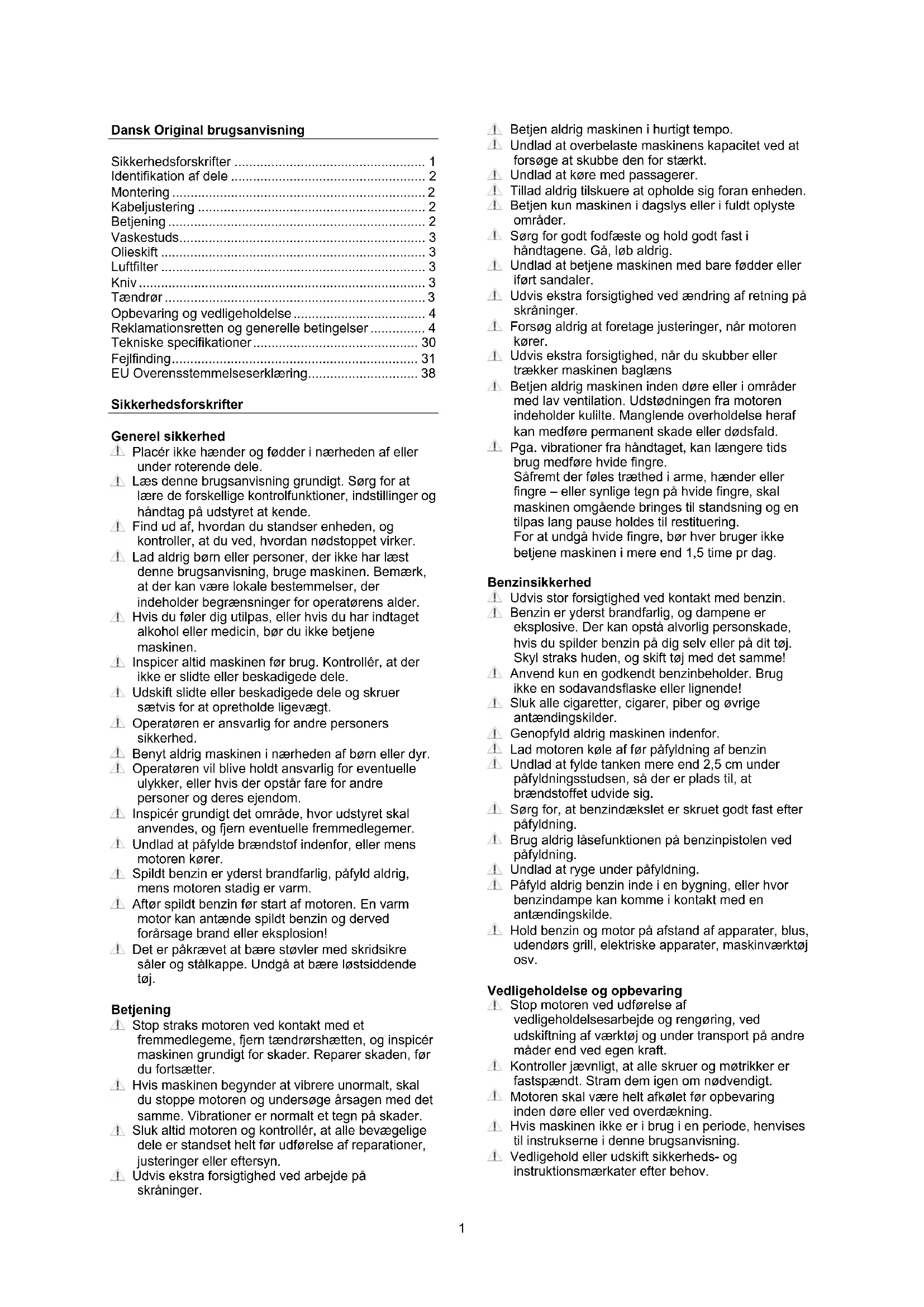 - EU Overensstemmelseserklæring Sikkerhedsforskrifter Generel sikkerhed Placér ikke hænder og fødder i nærheden af eller under roterende dele. Læs denne brugsanvisning grundigt. Sørg for at lære de forskellige kontrolfunktioner, indstillinger og håndtag på udstyret at kende. Find ud af, hvordan du standser enheden, og kontroller, at du ved, hvordan nødstoppet virker. Lad aldrig børn eller personer, der ikke har læst denne brugsanvisning, bruge maskinen. Bemærk, at der kan være lokale bestemmelser, der indeholder begrænsninger for operatørens alder. Hvis du føler dig utilpas, eller hvis du har indtaget alkohol eller medicin, bør du ikke betjene maskinen. Inspicer altid maskinen før brug. Kontrollér, at der ikke er slidte eller beskadigede dele. Udskift slidte eller beskadigede dele og skruer sætvis for at opretholde ligevægt. Operatøren er ansvarlig for andre personers sikkerhed. Benyt aldrig maskinen i nærheden af børn eller dyr. Operatøren vil blive holdt ansvarlig for eventuelle ulykker, eller hvis der opstår fare for andre personer og deres ejendom. Inspicér grundigt det område, hvor udstyret skal anvendes, og fjern eventuelle fremmedlegemer. Undlad at påfylde brændstof indenfor, eller mens motoren kører. Spildt benzin er yderst brandfarlig, påfyld aldrig, mens motoren stadig er varm. Aftør spildt benzin før start af motoren. En varm motor kan antænde spildt benzin og derved forårsage brand eller eksplosion! Det er påkrævet at bære støvler med skridsikre såler og stålkappe. Undgå at bære løstsiddende tøj. Betjening Stop straks motoren ved kontakt med et fremmedlegeme, fjern tændrørshætten, og inspicér maskinen grundigt for skader. Reparer skaden, før du fortsætter. Hvis maskinen begynder at vibrere unormalt, skal du stoppe motoren og undersøge årsagen med det samme. Vibrationer er normalt et tegn på skader. Sluk altid motoren og kontrollér, at alle bevægelige dele er standset helt før udførelse af reparationer, justeringer eller eftersyn. Udvis ekstra forsigtighed ved arbejde på skråninger. Betjen aldrig maskinen i hurtigt tempo. Undlad at overbelaste maskinens kapacitet ved at forsøge at skubbe den for stærkt. Undlad at køre med passagerer. Tillad aldrig tilskuere at opholde sig foran enheden. Betjen kun maskinen i dagslys eller i fuldt oplyste områder. Sørg for godt fodfæste og hold godt fast i håndtagene. Gå, løb aldrig. Undlad at betjene maskinen med bare fødder eller iført sandaler. Udvis ekstra forsigtighed ved ændring af retning på skråninger. Forsøg aldrig at foretage justeringer, når motoren kører. Udvis ekstra forsigtighed, når du skubber eller trækker maskinen baglæns Betjen aldrig maskinen inden døre eller i områder med lav ventilation. Udstødningen fra motoren indeholder kulilte. Manglende overholdelse heraf kan medføre permanent skade eller dødsfald. Pga. vibrationer fra håndtaget, kan længere tids brug medføre hvide fingre. Såfremt der føles træthed i arme, hænder eller fingre – eller synlige tegn på hvide fingre, skal maskinen omgående bringes til standsning og en tilpas lang pause holdes til restituering. For at undgå hvide fingre, bør hver bruger ikke betjene maskinen i mere end 1,5 time pr dag. Benzinsikkerhed Udvis stor forsigtighed ved kontakt med benzin. Benzin er yderst brandfarlig, og dampene er eksplosive. Der kan opstå alvorlig personskade, hvis du spilder benzin på dig selv eller på dit tøj. Skyl straks huden, og skift tøj med det samme! Anvend kun en godkendt benzinbeholder. Brug ikke en sodavandsflaske eller lignende! Sluk alle cigaretter, cigarer, piber og øvrige antændingskilder. Genopfyld aldrig maskinen indenfor. Lad motoren køle af før påfyldning af benzin Undlad at fylde tanken mere end 2,5 cm under påfyldningsstudsen, så der er plads til, at brændstoffet udvide sig. Sørg for, at benzindækslet er skruet godt fast efter påfyldning. Brug aldrig låsefunktionen på benzinpistolen ved påfyldning. Undlad at ryge under påfyldning. Påfyld aldrig benzin inde i en bygning, eller hvor benzindampe kan komme i kontakt med en antændingskilde. Hold benzin og motor på afstand af apparater, blus, udendørs grill, elektriske apparater, maskinværktøj osv. Vedligeholdelse og opbevaring Stop motoren ved udførelse af vedligeholdelsesarbejde og rengøring, ved udskiftning af værktøj og under transport på andre måder end ved egen kraft. Kontroller jævnligt, at alle skruer og møtrikker er fastspændt. Stram dem igen om nødvendigt. Motoren skal være helt afkølet før opbevaring inden døre eller ved overdækning. Hvis maskinen ikke er i brug i en periode, henvises til instrukserne i denne brugsanvisning. Vedligehold eller udskift sikkerheds- og instruktionsmærkater efter behov.2 Brug kun originale reservedele eller tilbehør. Hvis der ikke anvendes originale dele eller tilbehør, bortfalder garantien. Diverse Der er ikke påfyldt olie på motoren. Tjek altid motor olieniveau før start. Fabriksmonterede styreanordninger, f.eks. koblingskabler monteret på håndtaget, må ikke fjernes eller blotlægges. Tøm kun benzintanken udenfor. Benzin er yderst brandfarlig, og dampene er eksplosive. Kontrollér, at maskinen står ordentligt fast under transport, f.eks. på en ladvogn. Plæneklipperen er fremstillet i henhold til de seneste sikkerhedskrav. Disse omfatter et knivbremsesystem, der standser motor og kniv på 3 sekunder, når knivbremsen aktiveres. Enhver sikkerhedsforanstaltning er kun effektiv, når den bliver fulgt nøjagtigt. Følg nedenstående beskrivelse nøje, når du monterer din plæneklipper. Identifikation af dele Se Illustration ID Bemærk, illustrationerne kan variere fra din aktuelle model. B. Håndtag for motorstop C. Rekylstarter D. Vingemøtrik H. Benzinpåfyldning p. 38