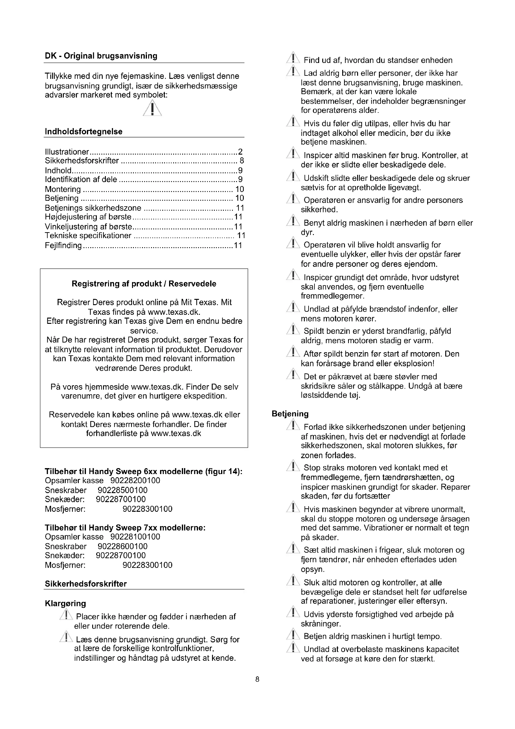 Registrering af produkt / Reservedele Registrer Deres produkt online på Mit Texas. Mit Texas findes på www.texas.dk. Efter registrering kan Texas give Dem en endnu bedre service. Når De har registreret Deres produkt, sørger Texas for at tilknytte relevant information til produktet. Derudover kan Texas kontakte Dem med relevant information vedrørende Deres produkt. På vores hjemmeside www.texas.dk. Finder De selv varenumre, det giver en hurtigere ekspedition. Reservedele kan købes online på www.texas.dk eller kontakt Deres nærmeste forhandler. De finder forhandlerliste på www.texas.dk