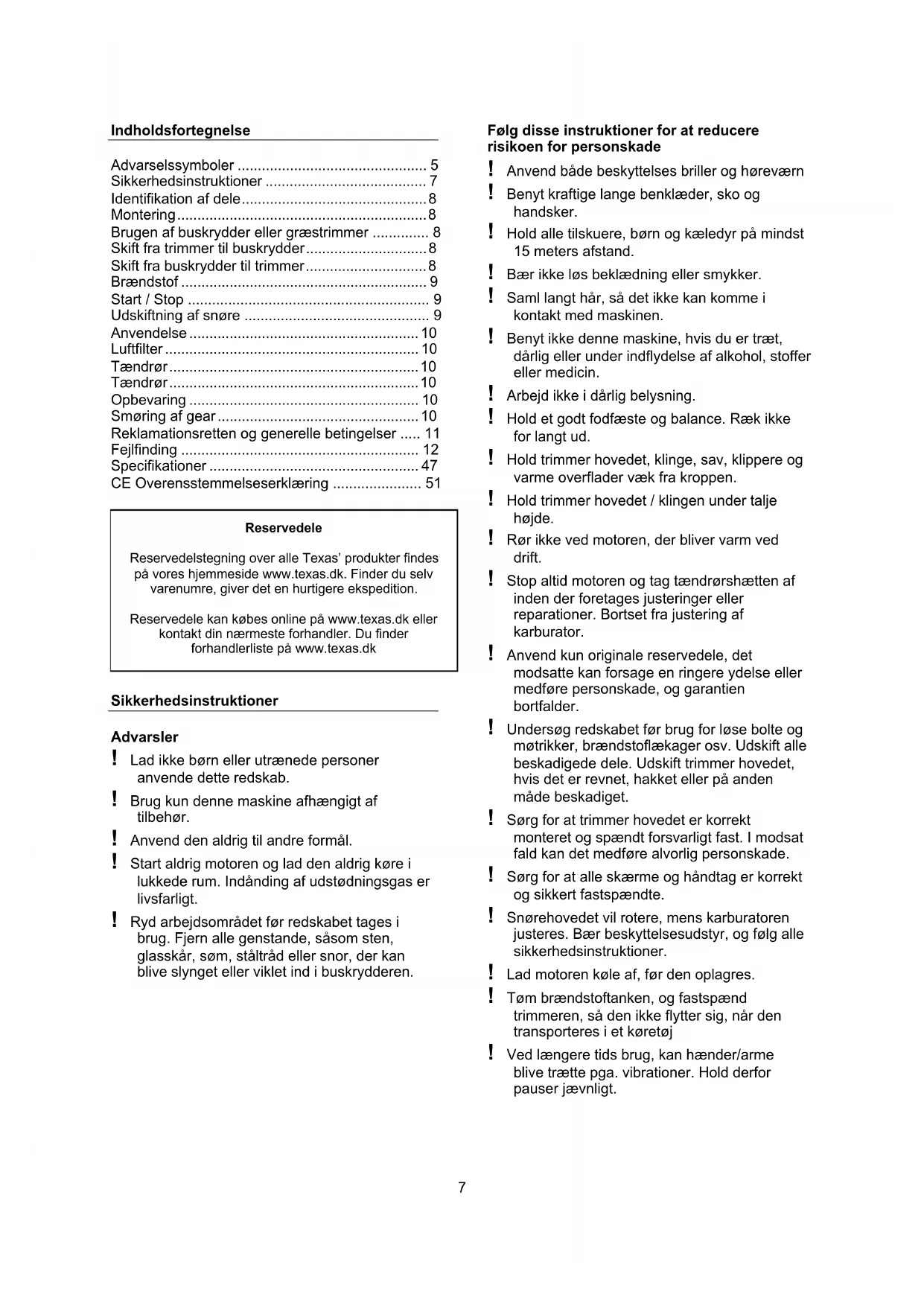 Følg disse instruktioner for at reducere risikoen for personskade ! Anvend både beskyttelses briller og høreværn ! Benyt kraftige lange benklæder, sko og handsker. ! Hold alle tilskuere, børn og kæledyr på mindst 15 meters afstand. ! Bær ikke løs beklædning eller smykker. ! Saml langt hår, så det ikke kan komme i kontakt med maskinen. ! Benyt ikke denne maskine, hvis du er træt, dårlig eller under indflydelse af alkohol, stoffer eller medicin. ! Arbejd ikke i dårlig belysning. ! Hold et godt fodfæste og balance. Ræk ikke for langt ud. ! Hold trimmer hovedet, klinge, sav, klippere og varme overflader væk fra kroppen. ! Hold trimmer hovedet / klingen under talje højde. ! Rør ikke ved motoren, der bliver varm ved drift. ! Stop altid motoren og tag tændrørshætten af inden der foretages justeringer eller reparationer. Bortset fra justering af karburator. ! Anvend kun originale reservedele, det modsatte kan forsage en ringere ydelse eller medføre personskade, og garantien bortfalder. ! Undersøg redskabet før brug for løse bolte og møtrikker, brændstoflækager osv. Udskift alle beskadigede dele. Udskift trimmer hovedet, hvis det er revnet, hakket eller på anden måde beskadiget. ! Sørg for at trimmer hovedet er korrekt monteret og spændt forsvarligt fast. I modsat fald kan det medføre alvorlig personskade. ! Sørg for at alle skærme og håndtag er korrekt og sikkert fastspændte. ! Snørehovedet vil rotere, mens karburatoren justeres. Bær beskyttelsesudstyr, og følg alle sikkerhedsinstruktioner. ! Lad motoren køle af, før den oplagres. ! Tøm brændstoftanken, og fastspænd trimmeren, så den ikke flytter sig, når den transporteres i et køretøj ! Ved længere tids brug, kan hænder/arme blive trætte pga. vibrationer. Hold derfor pauser jævnligt.