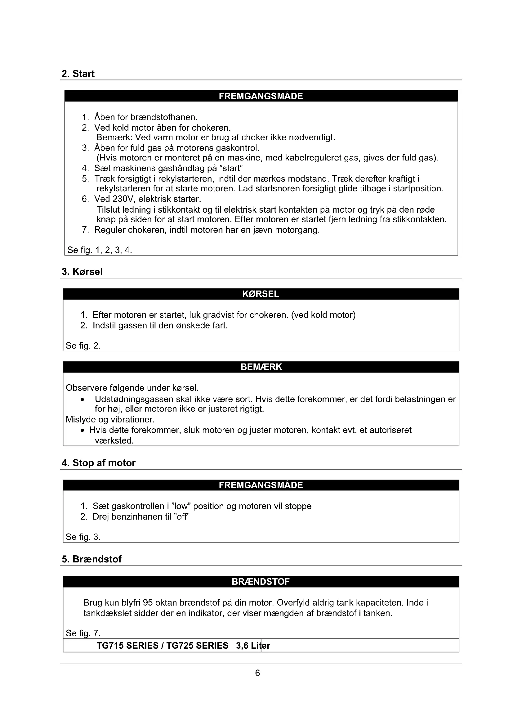 BRÆNDSTOF Brug kun blyfri 95 oktan brændstof på din motor. Overfyld aldrig tank kapaciteten. Inde i tankdækslet sidder der en indikator, der viser mængden af brændstof i tanken. Se fig. 7. TG715 SERIES / TG725 SERIES 3,6 Liter7