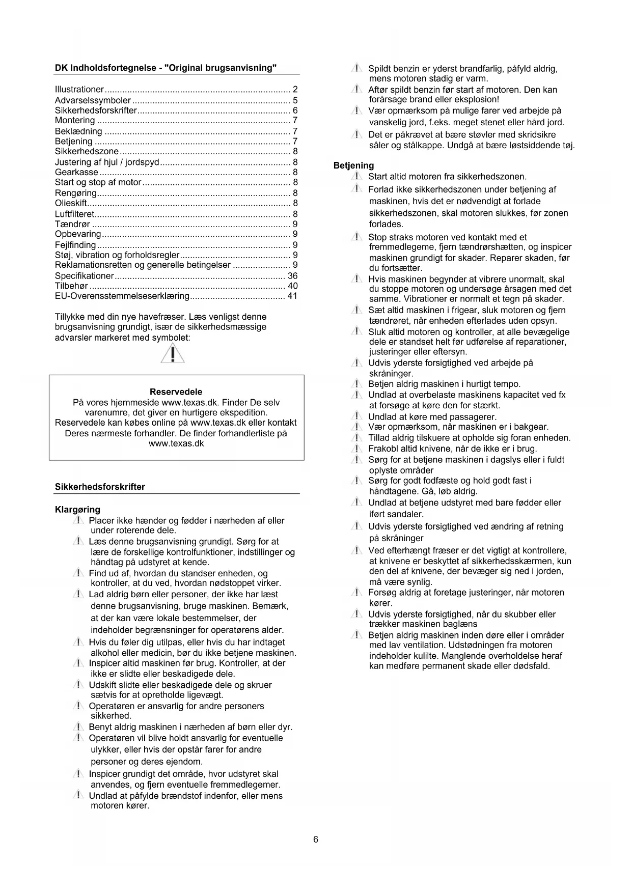 Reservedele På vores hjemmeside www.texas.dk. Finder De selv varenumre, det giver en hurtigere ekspedition. Reservedele kan købes online på www.texas.dk eller kontakt Deres nærmeste forhandler. De finder forhandlerliste på www.texas.dk
