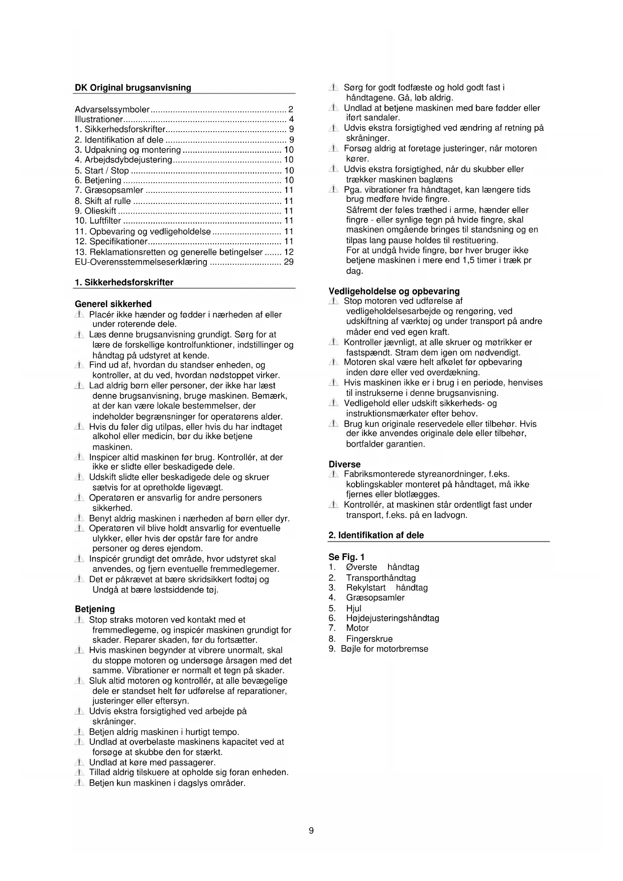 Generel sikkerhed Placér ikke hænder og fødder i nærheden af eller under roterende dele. Læs denne brugsanvisning grundigt. Sørg for at lære de forskellige kontrolfunktioner, indstillinger og håndtag på udstyret at kende. Find ud af, hvordan du standser enheden, og kontroller, at du ved, hvordan nødstoppet virker. Lad aldrig børn eller personer, der ikke har læst denne brugsanvisning, bruge maskinen. Bemærk, at der kan være lokale bestemmelser, der indeholder begrænsninger for operatørens alder. Hvis du føler dig utilpas, eller hvis du har indtaget alkohol eller medicin, bør du ikke betjene maskinen. Inspicer altid maskinen før brug. Kontrollér, at der ikke er slidte eller beskadigede dele. Udskift slidte eller beskadigede dele og skruer sætvis for at opretholde ligevægt. Operatøren er ansvarlig for andre personers sikkerhed. Benyt aldrig maskinen i nærheden af børn eller dyr. Operatøren vil blive holdt ansvarlig for eventuelle ulykker, eller hvis der opstår fare for andre personer og deres ejendom. Inspicér grundigt det område, hvor udstyret skal anvendes, og fjern eventuelle fremmedlegemer. Det er påkrævet at bære skridsikkert fodtøj og Undgå at bære løstsiddende tøj. Betjening Stop straks motoren ved kontakt med et fremmedlegeme, og inspicér maskinen grundigt for skader. Reparer skaden, før du fortsætter. Hvis maskinen begynder at vibrere unormalt, skal du stoppe motoren og undersøge årsagen med det samme. Vibrationer er normalt et tegn på skader. Sluk altid motoren og kontrollér, at alle bevægelige dele er standset helt før udførelse af reparationer, justeringer eller eftersyn. Udvis ekstra forsigtighed ved arbejde på skråninger. Betjen aldrig maskinen i hurtigt tempo. Undlad at overbelaste maskinens kapacitet ved at forsøge at skubbe den for stærkt. Undlad at køre med passagerer. Tillad aldrig tilskuere at opholde sig foran enheden. Betjen kun maskinen i dagslys områder. Sørg for godt fodfæste og hold godt fast i håndtagene. Gå, løb aldrig. Undlad at betjene maskinen med bare fødder eller iført sandaler. Udvis ekstra forsigtighed ved ændring af retning på skråninger. Forsøg aldrig at foretage justeringer, når motoren kører. Udvis ekstra forsigtighed, når du skubber eller trækker maskinen baglæns Pga. vibrationer fra håndtaget, kan længere tids brug medføre hvide fingre. Såfremt der føles træthed i arme, hænder eller fingre - eller synlige tegn på hvide fingre, skal maskinen omgående bringes til standsning og en tilpas lang pause holdes til restituering. For at undgå hvide fingre, bør hver bruger ikke betjene maskinen i mere end 1,5 timer i træk pr dag. Vedligeholdelse og opbevaring Stop motoren ved udførelse af vedligeholdelsesarbejde og rengøring, ved udskiftning af værktøj og under transport på andre måder end ved egen kraft. Kontroller jævnligt, at alle skruer og møtrikker er fastspændt. Stram dem igen om nødvendigt. Motoren skal være helt afkølet før opbevaring inden døre eller ved overdækning. Hvis maskinen ikke er i brug i en periode, henvises til instrukserne i denne brugsanvisning. Vedligehold eller udskift sikkerheds- og instruktionsmærkater efter behov. Brug kun originale reservedele eller tilbehør. Hvis der ikke anvendes originale dele eller tilbehør, bortfalder garantien. Diverse Fabriksmonterede styreanordninger, f.eks. koblingskabler monteret på håndtaget, må ikke fjernes eller blotlægges. Kontrollér, at maskinen står ordentligt fast under transport, f.eks. på en ladvogn.