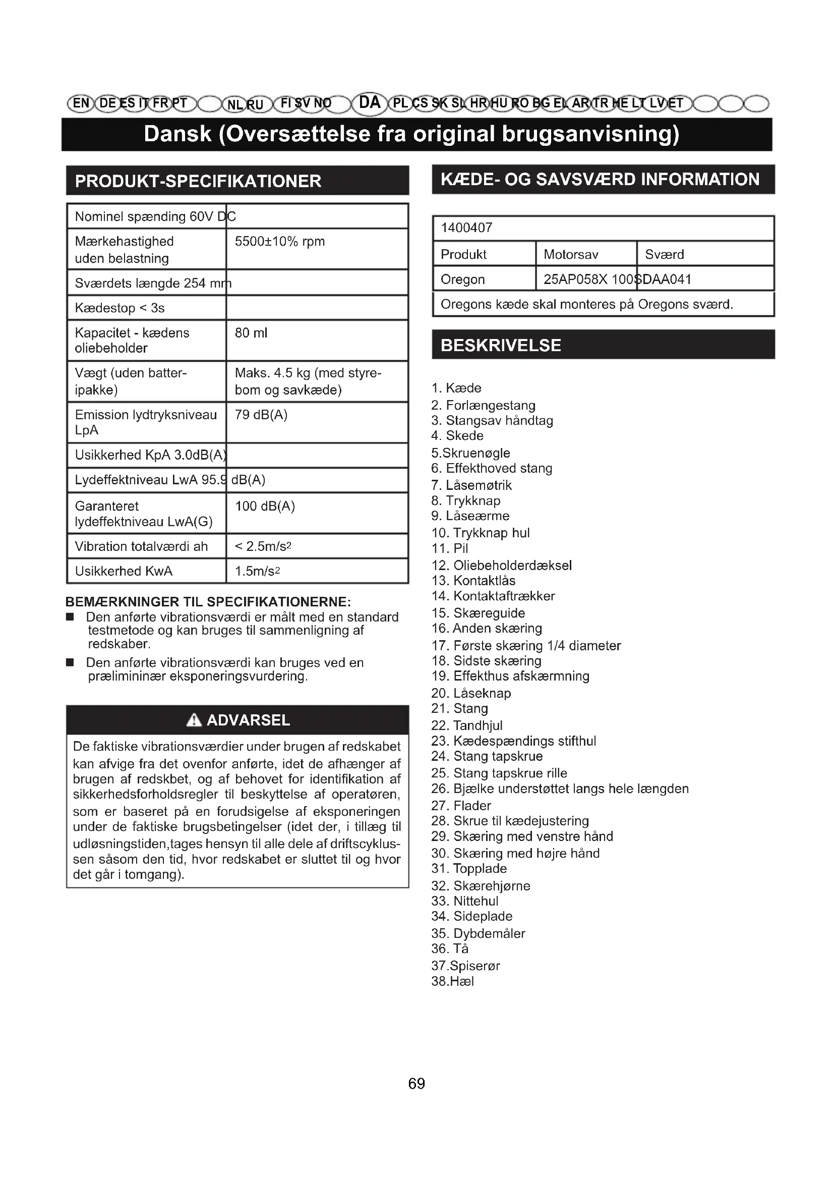 1400407Produkt Motorsav SværdOregon 25AP058X 100SDAA041Oregons kæde skal monteres på Oregons sværd. BESKRIVELSE 1. Kæde2. Forlængestang3. Stangsav håndtag4. Skede5.Skruenøgle6. Effekthoved stang7. Låsemøtrik8. Trykknap9. Låseærme10. Trykknap hul11. Pil12. Oliebeholderdæksel13. Kontaktlås14. Kontaktaftrækker15. Skæreguide16. Anden skæring17. Første skæring 1/4 diameter18. Sidste skæring19. Effekthus afskærmning20. Låseknap21. Stang22. Tandhjul23. Kædespændings stifthul24. Stang tapskrue25. Stang tapskrue rille26. Bjælke understøttet langs hele længden27. Flader28. Skrue til kædejustering29. Skæring med venstre hånd30. Skæring med højre hånd31. Topplade32. Skærehjørne33. Nittehul34. Sideplade35. Dybdemåler36. Tå37.Spiserør38.Hæl 69Dansk (Oversættelse fra original brugsanvisning)