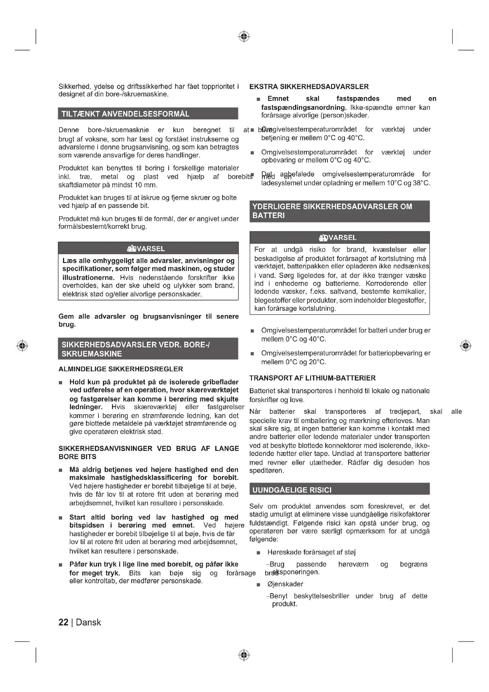 Selv om produktet anvendes som foreskrevet, er det stadig umuligt at eliminere visse uundgåelige risikofaktorer fuldstændigt. Følgende risici kan opstå under brug, og operatøren bør være særligt opmærksom for at undgå følgende: Ŷ +¡UHVNDGHIRUnUVDJHWDIVW¡M – Brug passende høreværn og begræns eksponeringen. Ŷ MHQVNDGHU – Benyt beskyttelsesbriller under brug af dette produkt.23 Dansk |