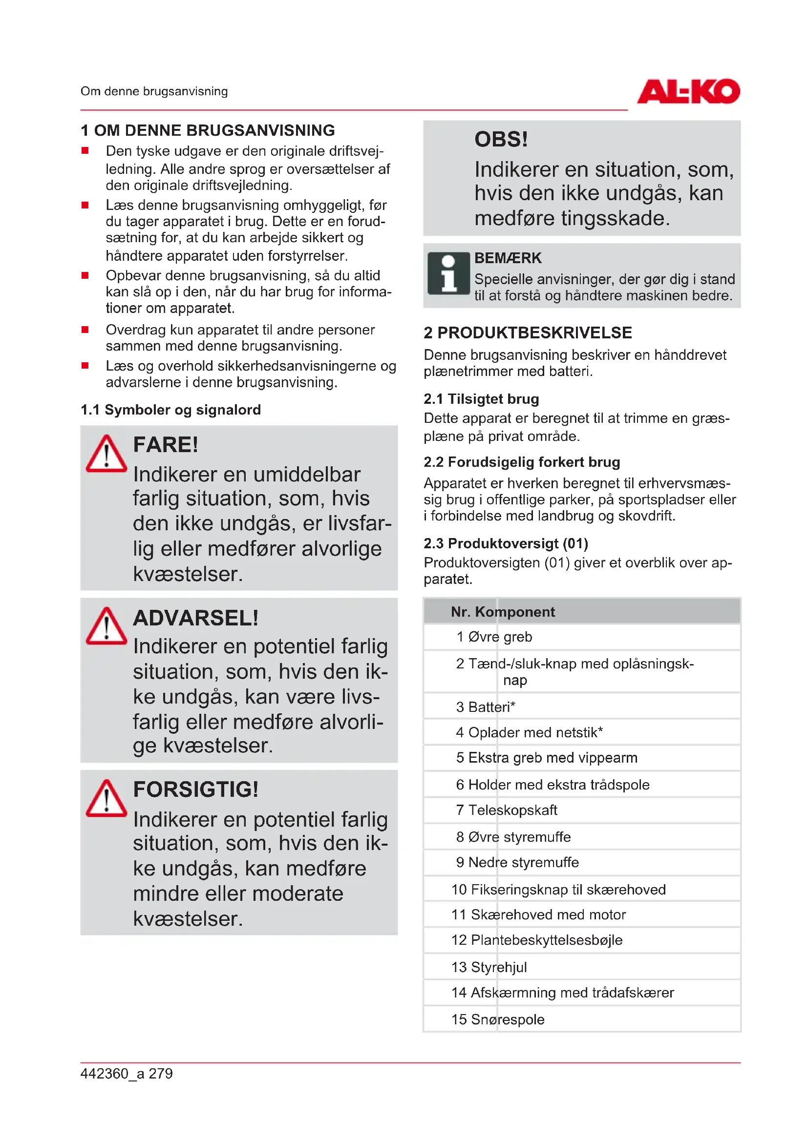 FARE! Indikerer en umiddelbar farlig situation, som, hvis den ikke undgås, er livsfar- lig eller medfører alvorlige kvæstelser. ADVARSEL! Indikerer en potentiel farlig situation, som, hvis den ik- ke undgås, kan være livs- farlig eller medføre alvorli- ge kvæstelser. FORSIGTIG! Indikerer en potentiel farlig situation, som, hvis den ik- ke undgås, kan medføre mindre eller moderate kvæstelser. OBS! Indikerer en situation, som, hvis den ikke undgås, kan medføre tingsskade. BEMÆRK Specielle anvisninger, der gør dig i stand til at forstå og håndtere maskinen bedre. 2 PRODUKTBESKRIVELSE Denne brugsanvisning beskriver en hånddrevet plænetrimmer med batteri.