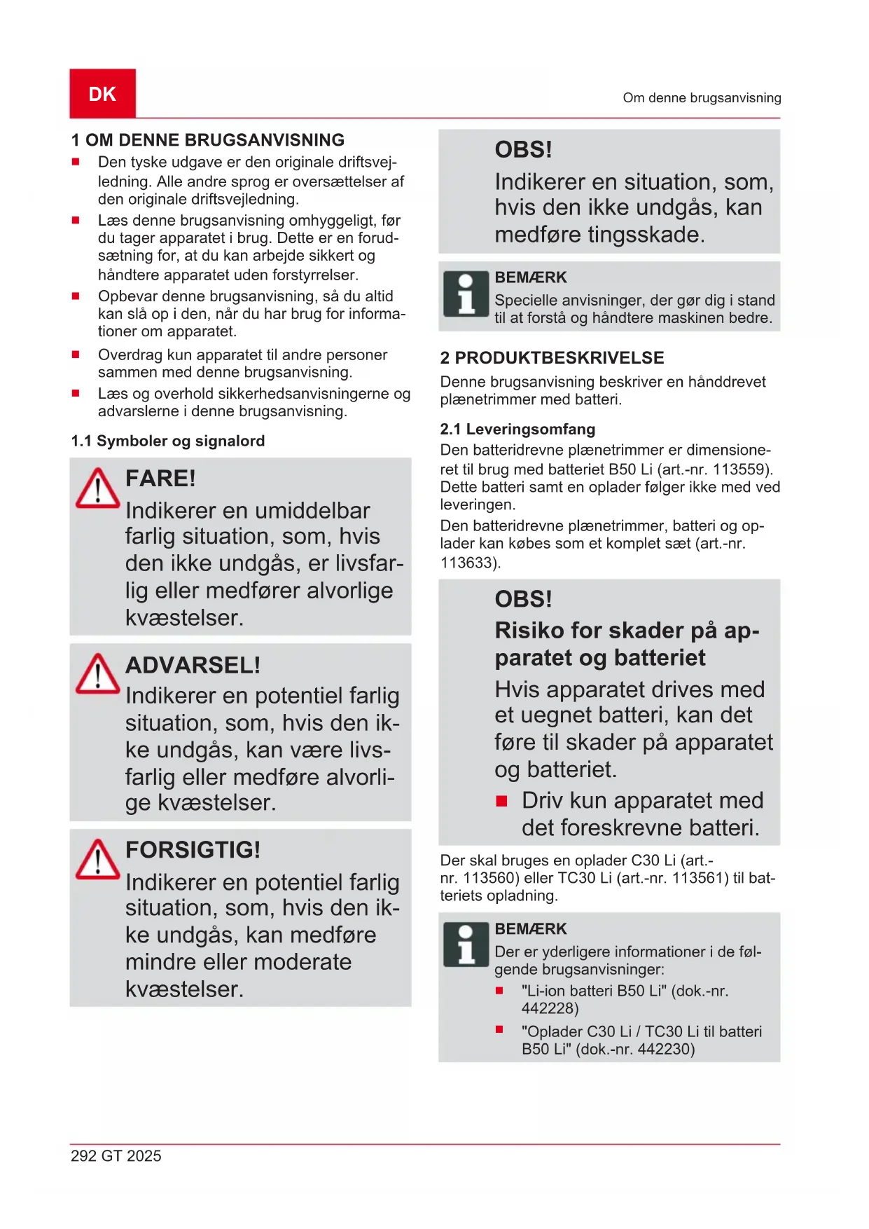 Den batteridrevne plænetrimmer er dimensione- ret til brug med batteriet B50 Li (art.-nr. 113559). Dette batteri samt en oplader følger ikke med ved leveringen. Den batteridrevne plænetrimmer, batteri og op- lader kan købes som et komplet sæt (art.-nr. 113633). OBS! Risiko for skader på ap- paratet og batteriet Hvis apparatet drives med et uegnet batteri, kan det føre til skader på apparatet og batteriet.