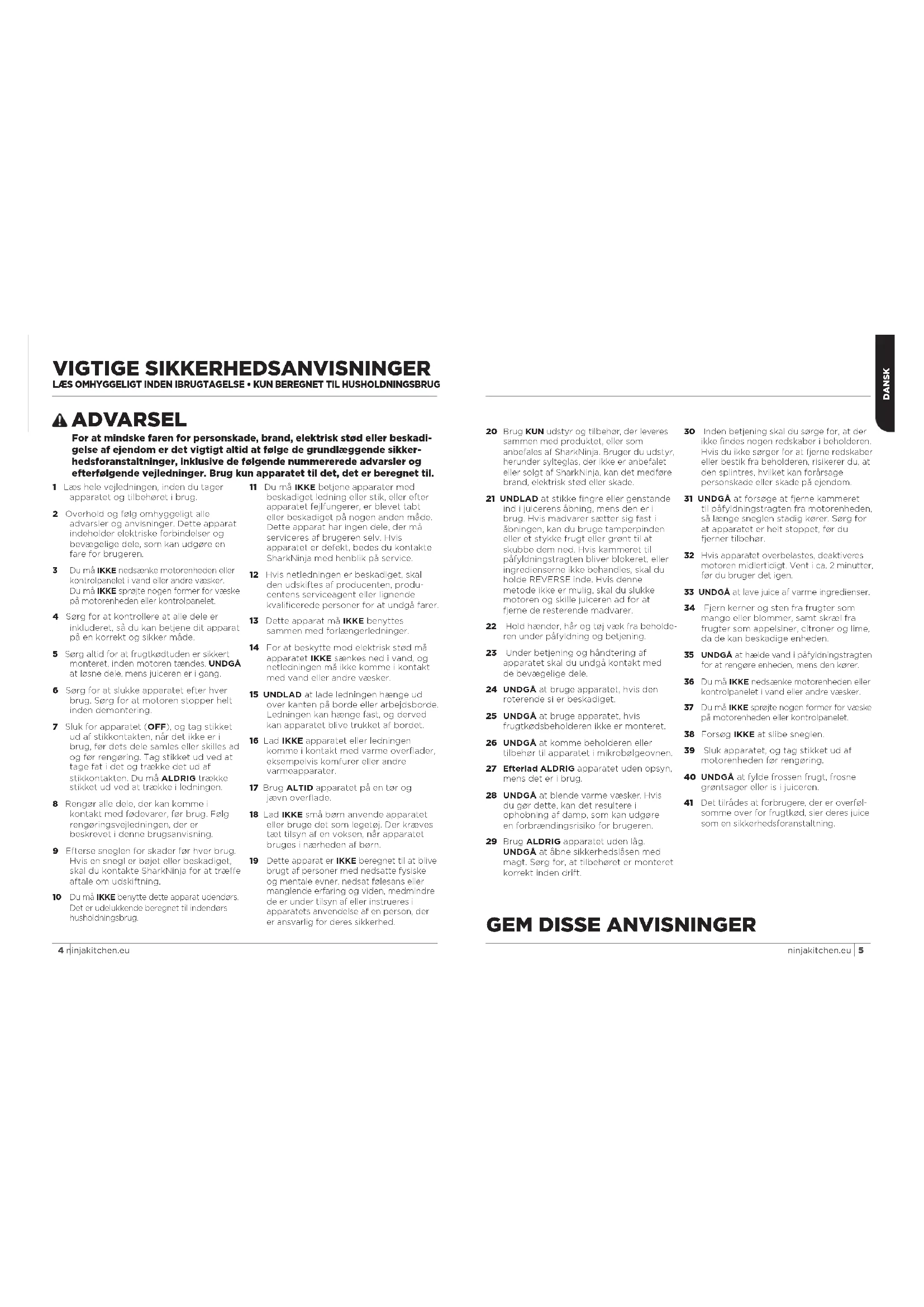 VIGTIGE SIKKERHEDSANVISNINGER LÆS OMHYGGELIGT INDEN IBRUGTAGELSE • KUN BEREGNET TIL HUSHOLDNINGSBRUG 1 Læs hele vejledningen, inden du tager apparatet og tilbehøret i brug. 2 Overhold og følg omhyggeligt alle advarsler og anvisninger. Dette apparat indeholder elektriske forbindelser og bevægelige dele, som kan udgøre en fare for brugeren. 3 Du må IKKE nedsænke motorenheden eller kontrolpanelet i vand eller andre væsker. Du må IKKE sprøjte nogen former for væske på motorenheden eller kontrolpanelet. 4 Sørg for at kontrollere at alle dele er inkluderet, så du kan betjene dit apparat på en korrekt og sikker måde. 5 Sørg altid for at frugtkødtuden er sikkert monteret, inden motoren tændes. UNDGÅ at løsne dele, mens juiceren er i gang. 6 Sørg for at slukke apparatet efter hver brug. Sørg for at motoren stopper helt inden demontering. 7 Sluk for apparatet (OFF), og tag stikket ud af stikkontakten, når det ikke er i brug, før dets dele samles eller skilles ad og før rengøring. Tag stikket ud ved at tage fat i det og trække det ud af stikkontakten. Du må ALDRIG trække stikket ud ved at trække i ledningen. 8 Rengør alle dele, der kan komme i kontakt med fødevarer, før brug. Følg rengøringsvejledningen, der er beskrevet i denne brugsanvisning. 9 Efterse sneglen for skader før hver brug. Hvis en snegl er bøjet eller beskadiget, skal du kontakte SharkNinja for at træe aftale om udskiftning. 10 Du må IKKE benytte dette apparat udendørs. Det er udelukkende beregnet til indendørs husholdningsbrug. 11 Du må IKKE betjene apparater med beskadiget ledning eller stik, eller efter apparatet fejlfungerer, er blevet tabt eller beskadiget på nogen anden måde. Dette apparat har ingen dele, der må serviceres af brugeren selv. Hvis apparatet er defekt, bedes du kontakte SharkNinja med henblik på service. 12 Hvis netledningen er beskadiget, skal den udskiftes af producenten, produ- centens serviceagent eller lignende kvalificerede personer for at undgå farer. 13 Dette apparat må IKKE benyttes sammen med forlængerledninger. 14 For at beskytte mod elektrisk stød må apparatet IKKE sænkes ned i vand, og netledningen må ikke komme i kontakt med vand eller andre væsker. 15 UNDLAD at lade ledningen hænge ud over kanten på borde eller arbejdsborde. Ledningen kan hænge fast, og derved kan apparatet blive trukket af bordet. 16 Lad IKKE apparatet eller ledningen komme i kontakt med varme overflader, eksempelvis komfurer eller andre varmeapparater. 17 Brug ALTID apparatet på en tør og jævnoverflade. 18 Lad IKKE små børn anvende apparatet eller bruge det som legetøj. Der kræves tæt tilsyn af en voksen, når apparatet bruges i nærheden af børn. 19 Dette apparat er IKKE beregnet til at blive brugt af personer med nedsatte fysiske og mentale evner, nedsat følesans eller manglende erfaring og viden, medmindre de er under tilsyn af eller instrueres i apparatets anvendelse af en person, der er ansvarlig for deres sikkerhed. 20 Brug KUN udstyr og tilbehør, der leveres sammen med produktet, eller som anbefales af SharkNinja. Bruger du udstyr, herunder sylteglas, der ikke er anbefalet eller solgt af SharkNinja, kan det medføre brand, elektrisk stød eller skade. 21 UNDLAD at stikke fingre eller genstande ind i juicerens åbning, mens den er i brug. Hvis madvarer sætter sig fast i åbningen, kan du bruge tamperpinden eller et stykke frugt eller grønt til at skubbe dem ned. Hvis kammeret til påfyldningstragten bliver blokeret, eller ingredienserne ikke behandles, skal du holde REVERSE inde. Hvis denne metode ikke er mulig, skal du slukke motoren og skille juiceren ad for at fjerne de resterende madvarer. 22 Hold hænder, hår og tøj væk fra beholde- ren under påfyldning og betjening. 23 Under betjening og håndtering af apparatet skal du undgå kontakt med de bevægelige dele. 24 UNDGÅ at bruge apparatet, hvis den roterende si er beskadiget. 25 UNDGÅ at bruge apparatet, hvis frugtkødsbeholderen ikke er monteret. 26 UNDGÅ at komme beholderen eller tilbehør til apparatet i mikrobølgeovnen. 27 Efterlad ALDRIG apparatet uden opsyn, mens det er i brug. 28 UNDGÅ at blende varme væsker. Hvis du gør dette, kan det resultere i ophobning af damp, som kan udgøre enforbrændingsrisiko for brugeren. 29 Brug ALDRIG apparatet uden låg. UNDGÅ at åbne sikkerhedslåsen med magt. Sørg for, at tilbehøret er monteret korrekt inden drift. 30 Inden betjening skal du sørge for, at der ikke findes nogen redskaber i beholderen. Hvis du ikke sørger for at fjerne redskaber eller bestik fra beholderen, risikerer du, at den splintres, hvilket kan forårsage personskade eller skade på ejendom. 31 UNDGÅ at forsøge at fjerne kammeret til påfyldningstragten fra motorenheden, så længe sneglen stadig kører. Sørg for at apparatet er helt stoppet, før du fjerner tilbehør. 32 Hvis apparatet overbelastes, deaktiveres motoren midlertidigt. Vent i ca. 2minutter, før du bruger det igen. 33 UNDGÅ at lave juice af varme ingredienser. 34 Fjern kerner og sten fra frugter som mango eller blommer, samt skræl fra frugter som appelsiner, citroner og lime, da de kan beskadige enheden. 35 UNDGÅ at hælde vand i påfyldningstragten for at rengøre enheden, mens den kører. 36 Du må IKKE nedsænke motorenheden eller kontrolpanelet i vand eller andre væsker. 37 Du må IKKE sprøjte nogen former for væske på motorenheden eller kontrolpanelet. 38 Forsøg IKKE at slibe sneglen. 39 Sluk apparatet, og tag stikket ud af motorenheden før rengøring. 40 UNDGÅ at fylde frossen frugt, frosne grøntsager eller is i juiceren. 41 Det tilrådes at forbrugere, der er overføl- somme over for frugtkød, sier deres juice som en sikkerhedsforanstaltning. ADVARSEL For at mindske faren for personskade, brand, elektrisk stød eller beskadi- gelse af ejendom er det vigtigt altid at følge de grundlæggende sikker- hedsforanstaltninger, inklusive de følgende nummererede advarsler og efterfølgende ve