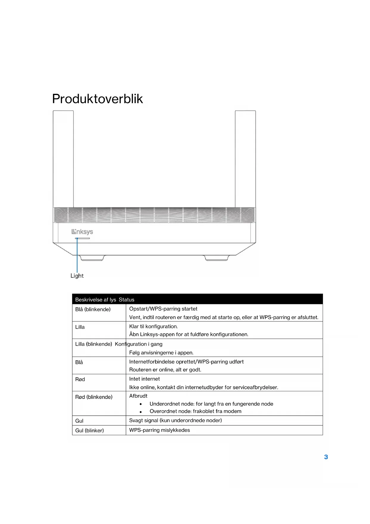 Beskrivelse af lys Status Blå (blinkende) Opstart/WPS-parring startet Vent, indtil routeren er færdig med at starte op, eller at WPS-parring er afsluttet. Lilla Klar til konfiguration. Åbn Linksys-appen for at fuldføre konfigurationen. Lilla (blinkende) Konfiguration i gang Følg anvisningerne i appen. Blå Internetforbindelse oprettet/WPS-parring udført Routeren er online, alt er godt. Rød Intet internet Ikke online, kontakt din internetudbyder for serviceafbrydelser. Rød (blinkende) Afbrudt