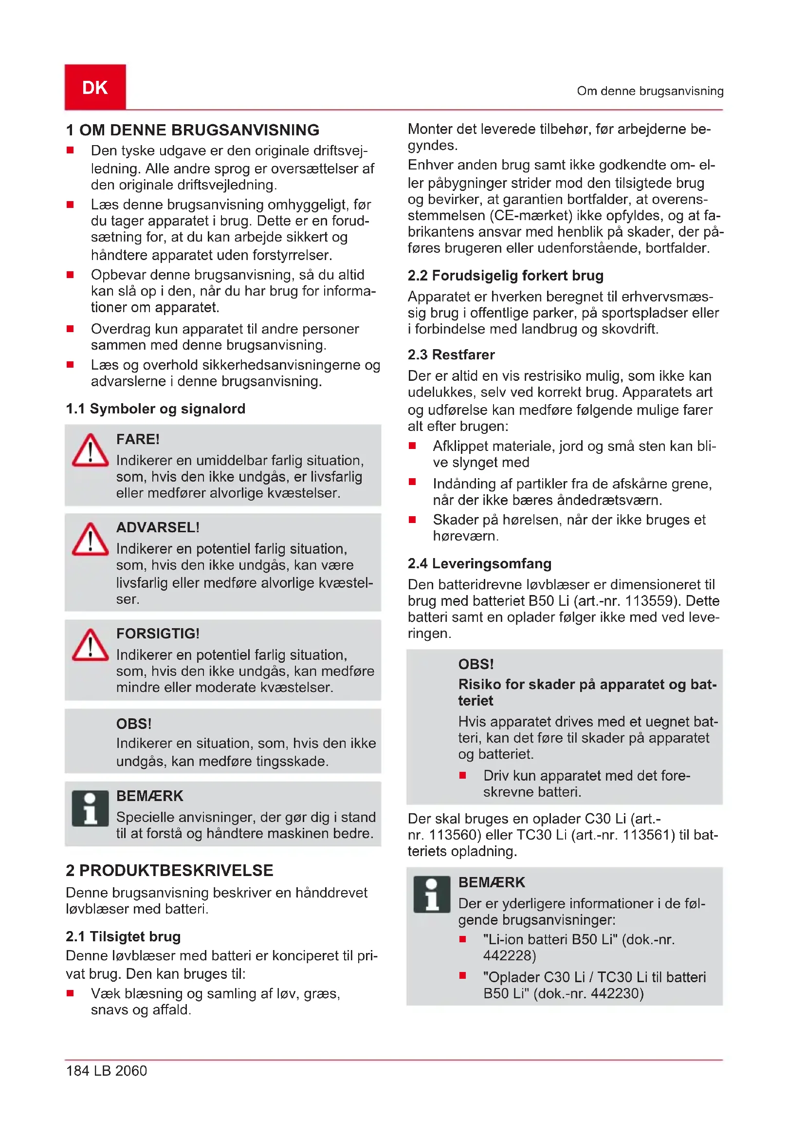 FARE! Indikerer en umiddelbar farlig situation, som, hvis den ikke undgås, er livsfarlig eller medfører alvorlige kvæstelser. ADVARSEL! Indikerer en potentiel farlig situation, som, hvis den ikke undgås, kan være livsfarlig eller medføre alvorlige kvæstel- ser. FORSIGTIG! Indikerer en potentiel farlig situation, som, hvis den ikke undgås, kan medføre mindre eller moderate kvæstelser. OBS! Indikerer en situation, som, hvis den ikke undgås, kan medføre tingsskade. BEMÆRK Specielle anvisninger, der gør dig i stand til at forstå og håndtere maskinen bedre. 2 PRODUKTBESKRIVELSE Denne brugsanvisning beskriver en hånddrevet løvblæser med batteri.