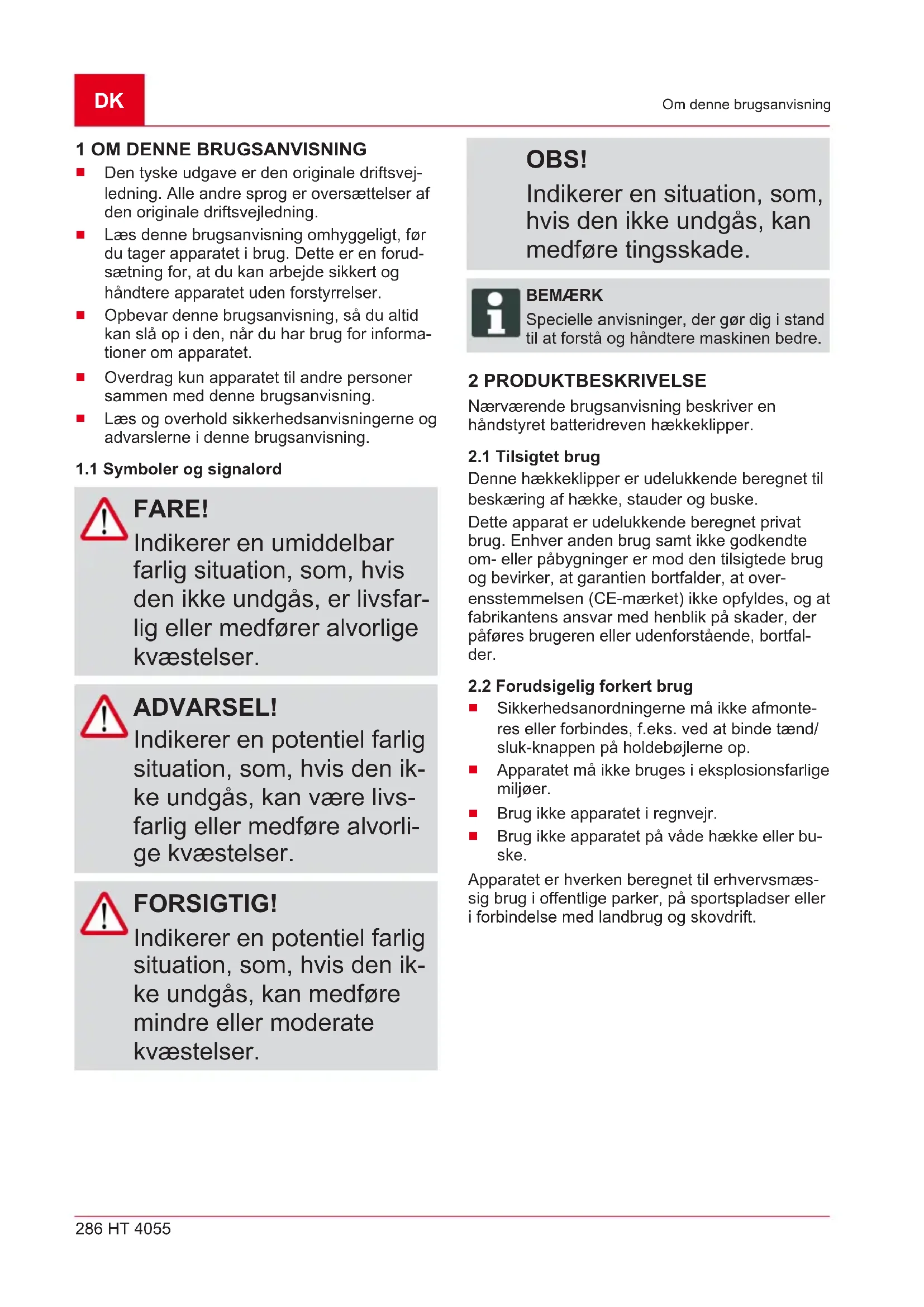 FARE! Indikerer en umiddelbar farlig situation, som, hvis den ikke undgås, er livsfar- lig eller medfører alvorlige kvæstelser. ADVARSEL! Indikerer en potentiel farlig situation, som, hvis den ik- ke undgås, kan være livs- farlig eller medføre alvorli- ge kvæstelser. FORSIGTIG! Indikerer en potentiel farlig situation, som, hvis den ik- ke undgås, kan medføre mindre eller moderate kvæstelser. OBS! Indikerer en situation, som, hvis den ikke undgås, kan medføre tingsskade. BEMÆRK Specielle anvisninger, der gør dig i stand til at forstå og håndtere maskinen bedre. 2 PRODUKTBESKRIVELSE Nærværende brugsanvisning beskriver en håndstyret batteridreven hækkeklipper.