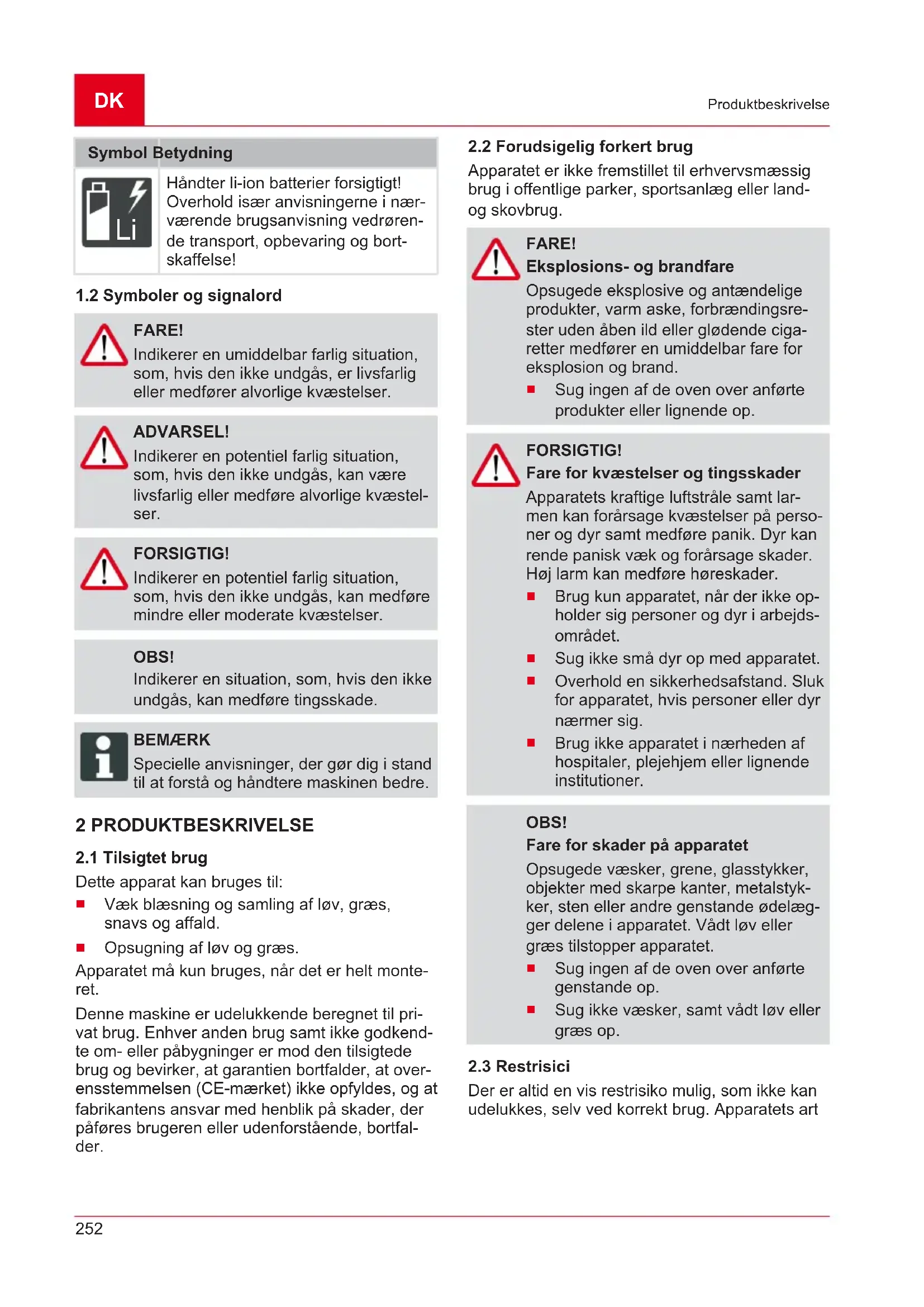 Apparatet er ikke fremstillet til erhvervsmæssig brug i offentlige parker, sportsanlæg eller land- og skovbrug. FARE! Eksplosions- og brandfare Opsugede eksplosive og antændelige produkter, varm aske, forbrændingsre- ster uden åben ild eller glødende ciga- retter medfører en umiddelbar fare for eksplosion og brand.