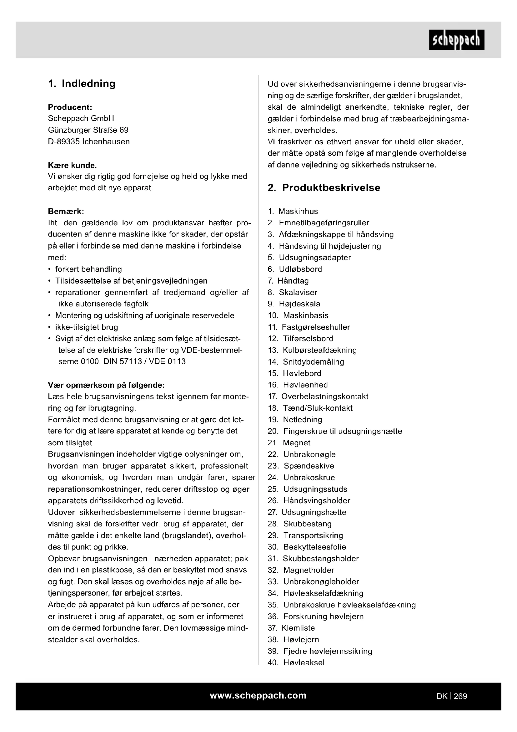 Producent: Scheppach GmbH Günzburger Straße 69 D-89335 Ichenhausen Kære kunde, Vi ønsker dig rigtig god fornøjelse og held og lykke med arbejdet med dit nye apparat. Bemærk: Iht. den gældende lov om produktansvar hæfter pro- ducenten af denne maskine ikke for skader, der opstår på eller i forbindelse med denne maskine i forbindelse med:
